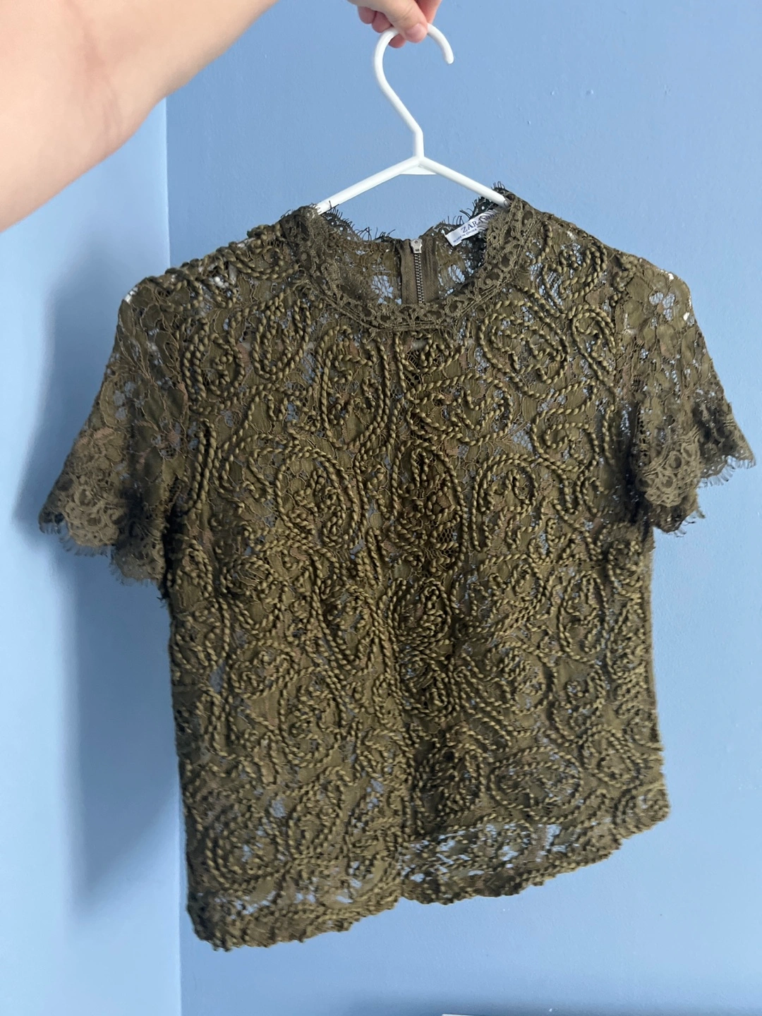 Selling a Zara lace top in a beautiful olive green colour. It's a size small and features a high neckline and short sleeves. The lace detailing is really intricate and adds a touch of elegance to any outfit