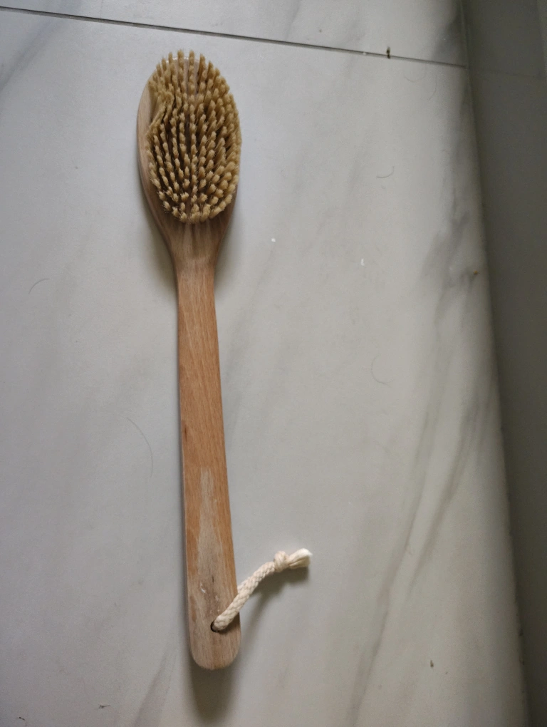 Selling a wooden bristle body brush. It has a long handle to reach your back and other areas. Has a rope at the end of the handle for hanging to dry