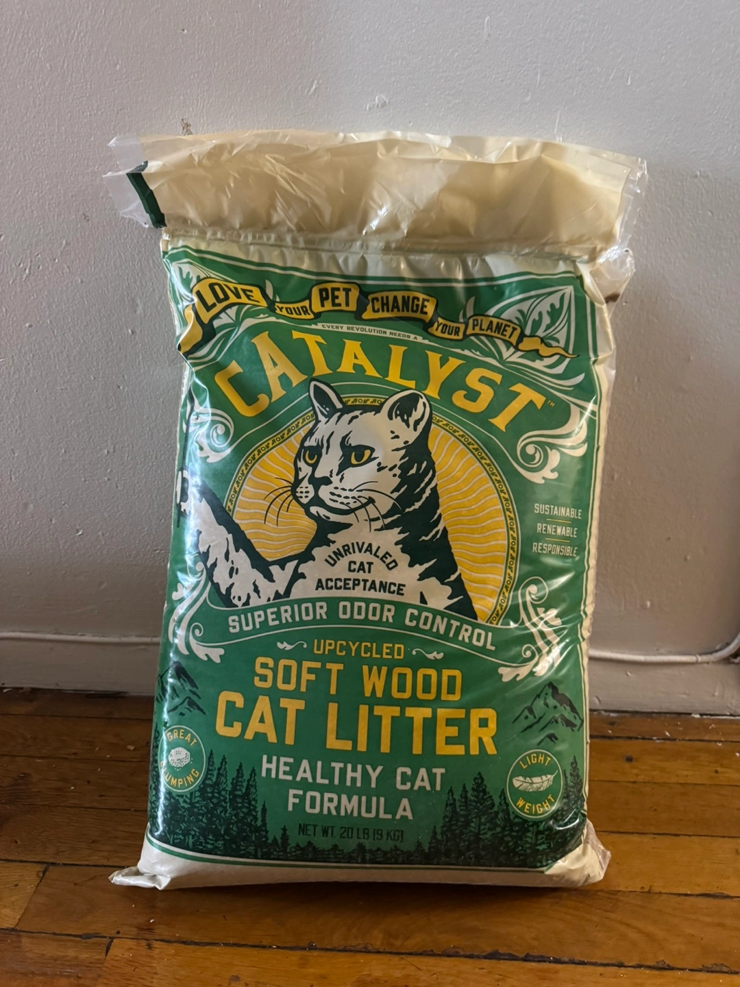 Selling a bag of Catalyst Soft Wood Cat Litter. It's a healthy cat formula that offers superior odor control. The litter is upcycled, sustainable, renewable, and responsible. Net weight is 20 lb (9 kg) brand new never opened.