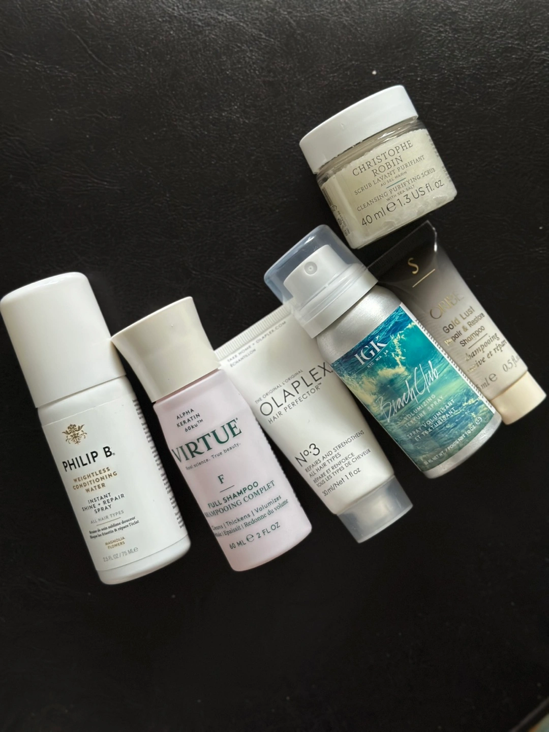 ✨collection of various travel size haircare products! Includes brands like Virtue, Olaplex, Philip B, Christophe Robin, IGK, and Oribe. Perfect for trying out different products or travel-sized goodies