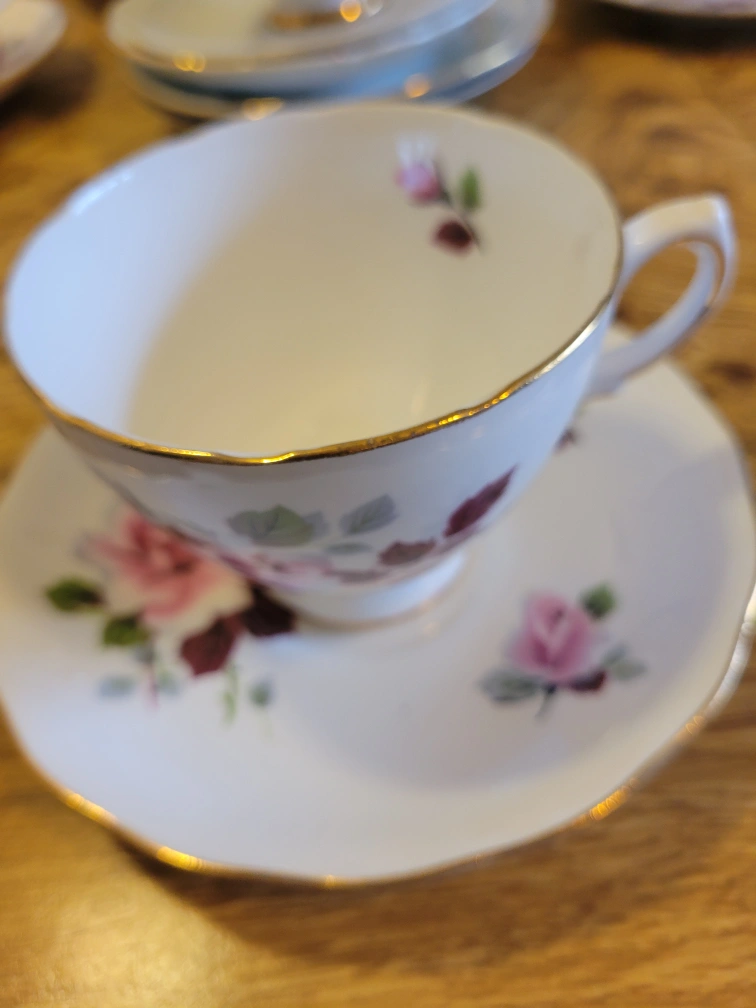 Selling a lovely Royal Vale bone china teacup and saucer set. It's in great condition with a delicate floral pattern and gold trim. Perfect for tea time or as a decorative piece!