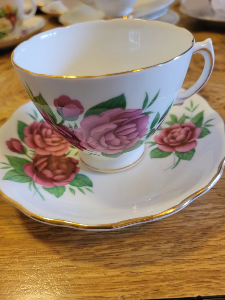 Beautiful Royal Vale bone china tea cup and saucer set! The set features a lovely floral design with pink and red roses. Made in England, it's perfect for tea time or as a decorative piece!