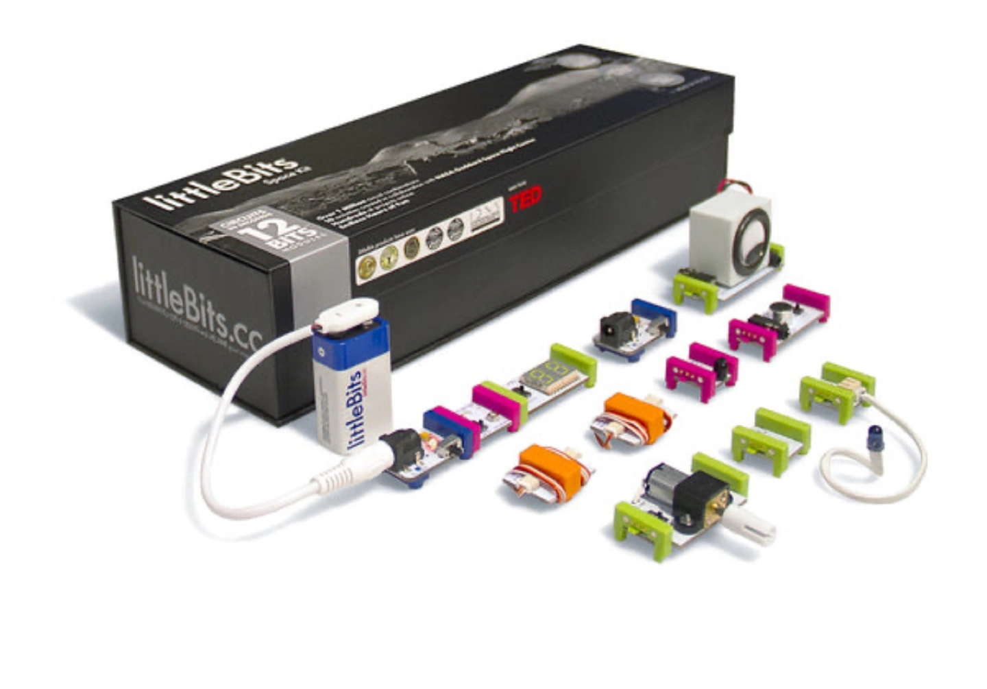 Included are 12 different Bits that snap together with magnets to create space projects, two 9V alkaline batteries and cables, a small screwdriver to modify a micro adjuster, and a full-color instruction booklet with 10 fun inventions to create.