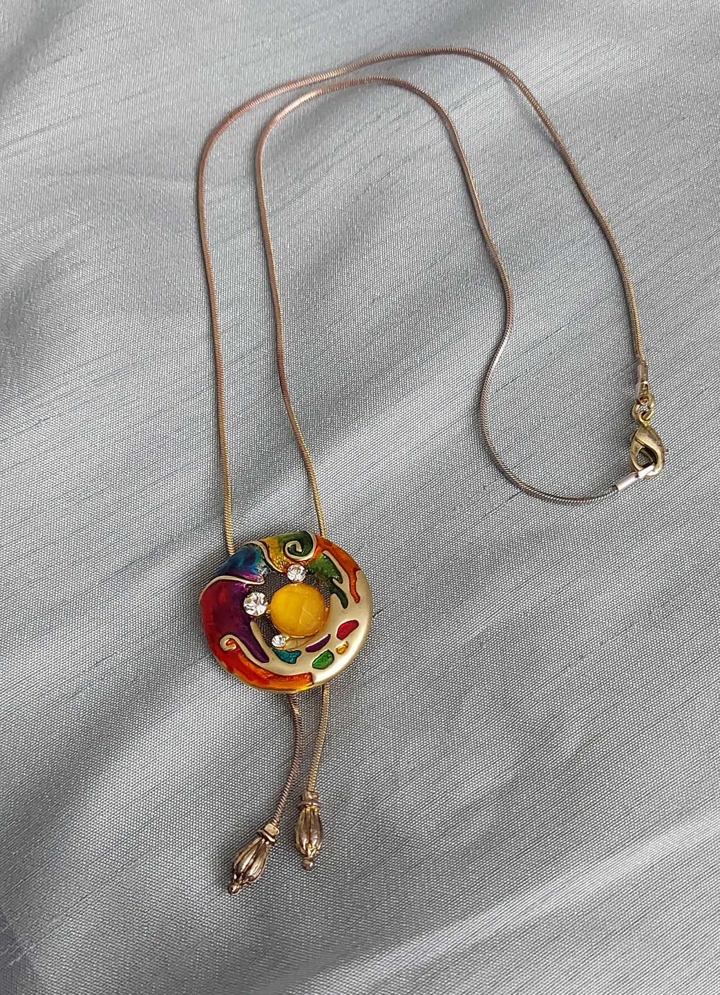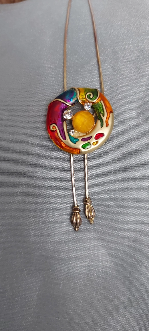 Selling a unique and colourful necklace! It features a circular pendant with a vibrant enamel design and a central yellow stone, complemented by small clear crystals. The necklace has a gold-tone chain and a bolo-style design with decorative tips. It's a fun piece to add a pop of colour to any outfit