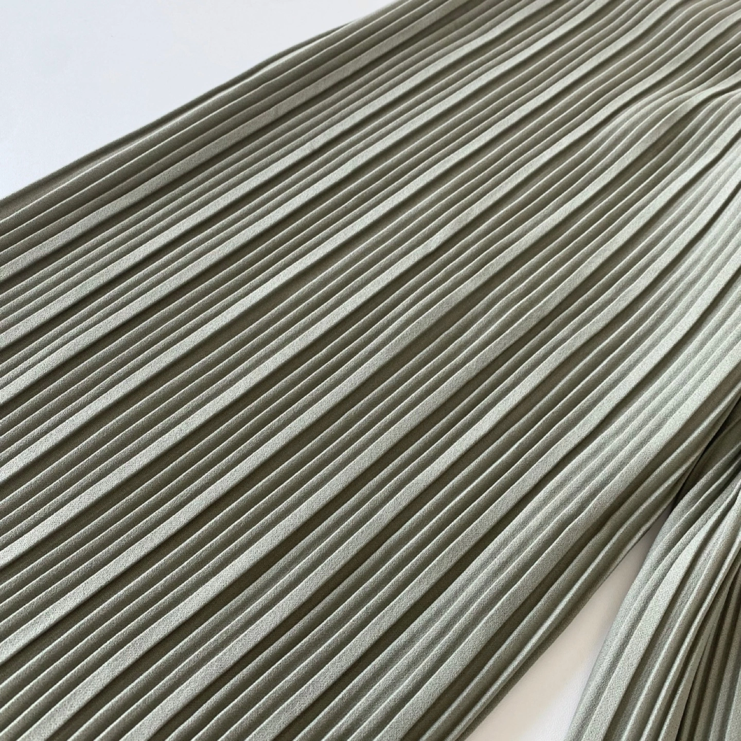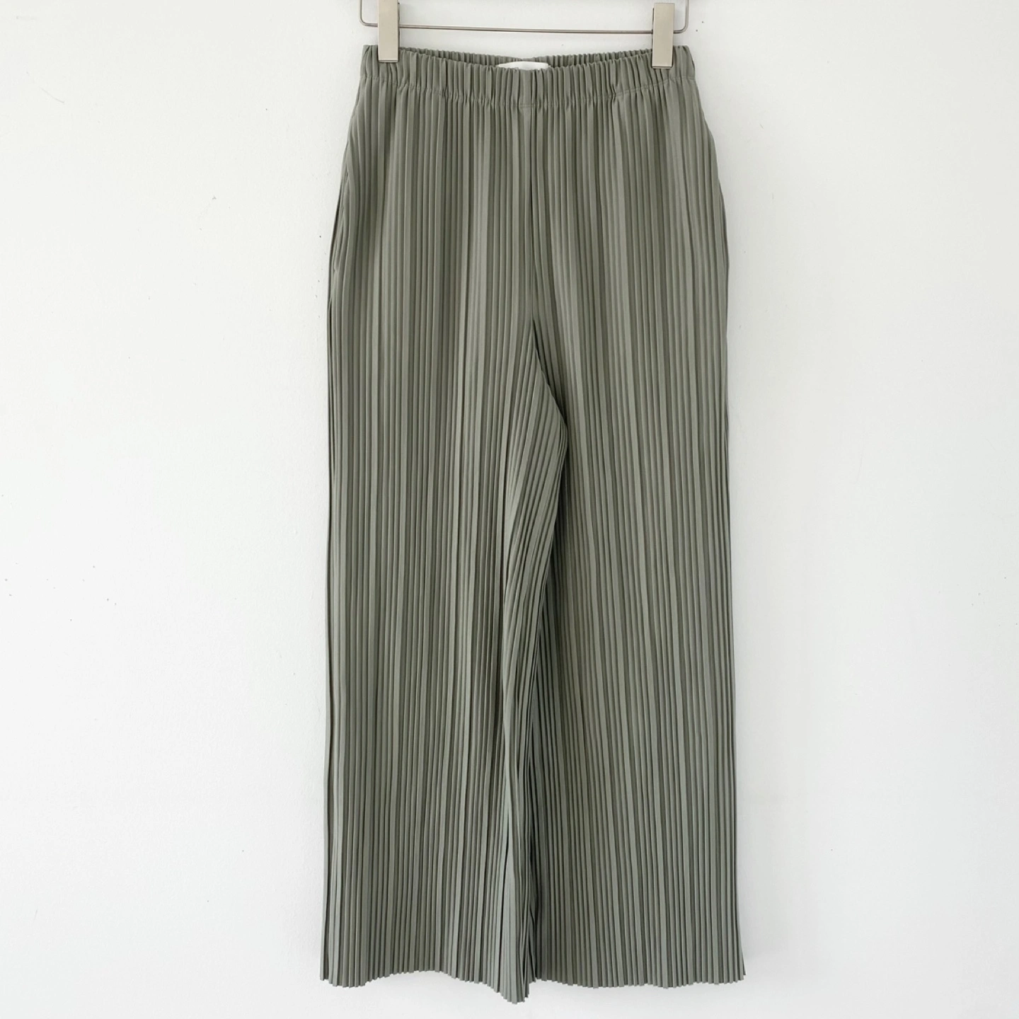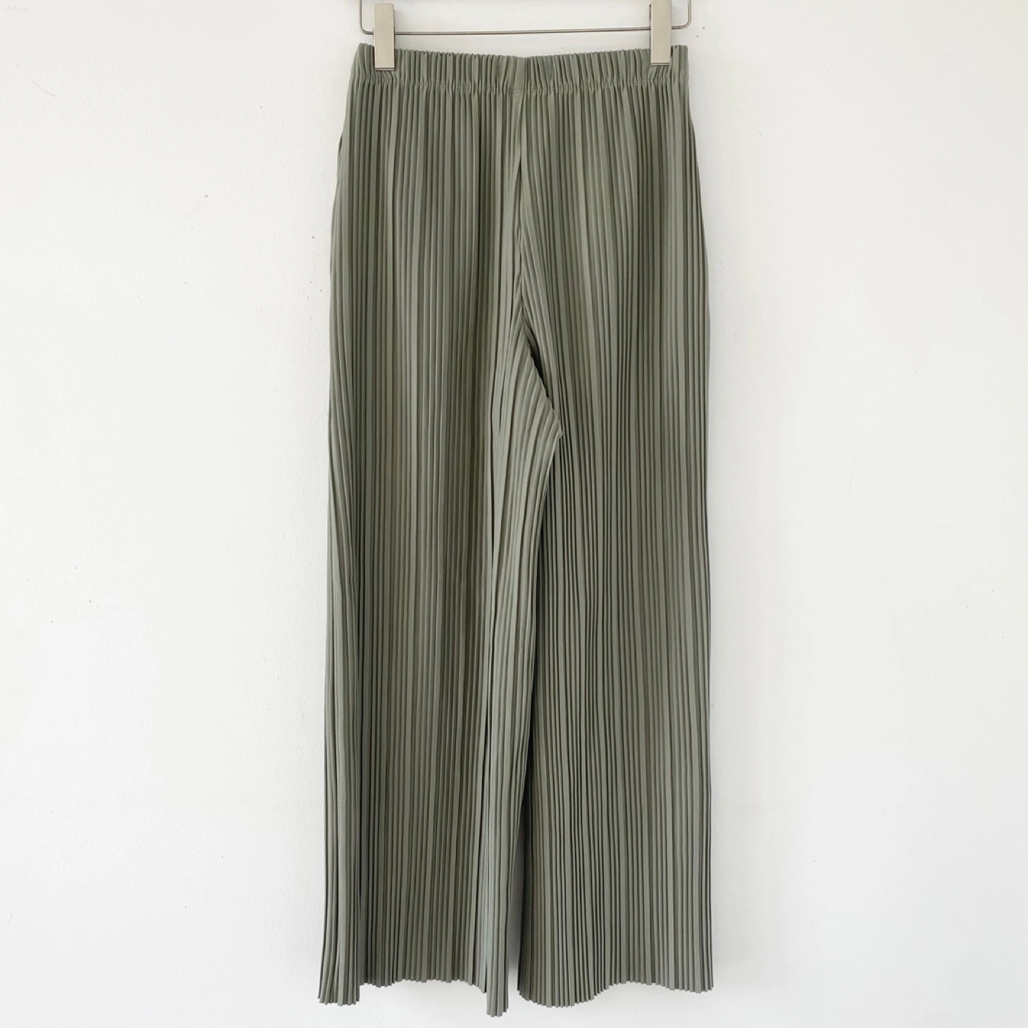 Oak and Fort pleated pants. Features a high waist, elasticated waistband, side seam pockets and straight leg. Made of mediumweight pleated fabric in a matte sage green colour. Reminds me of Issey Miyake’s Pleat Please. There's no staining or damage. They are clean and in excellent condition.