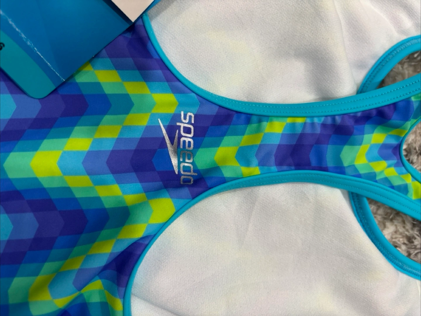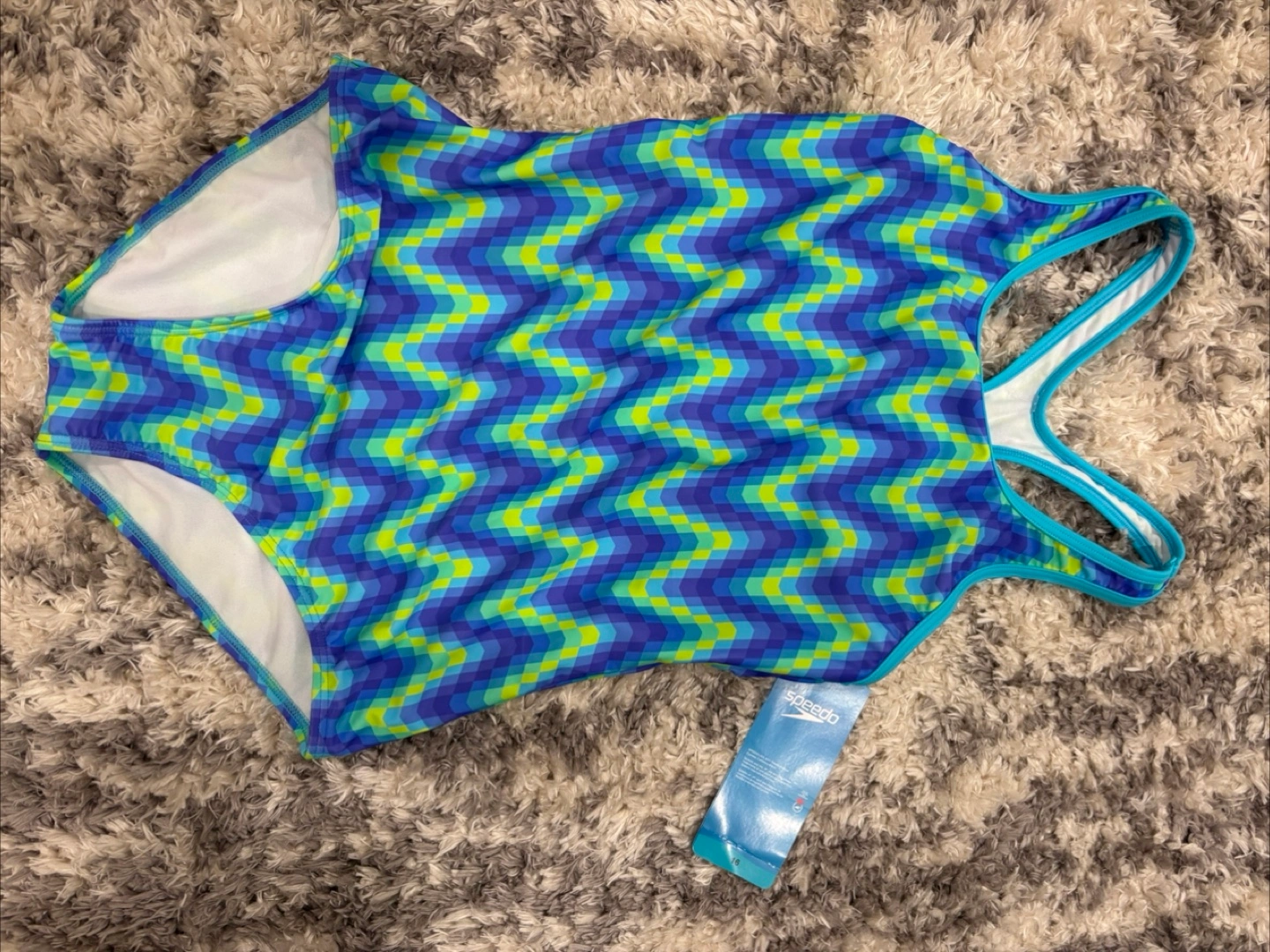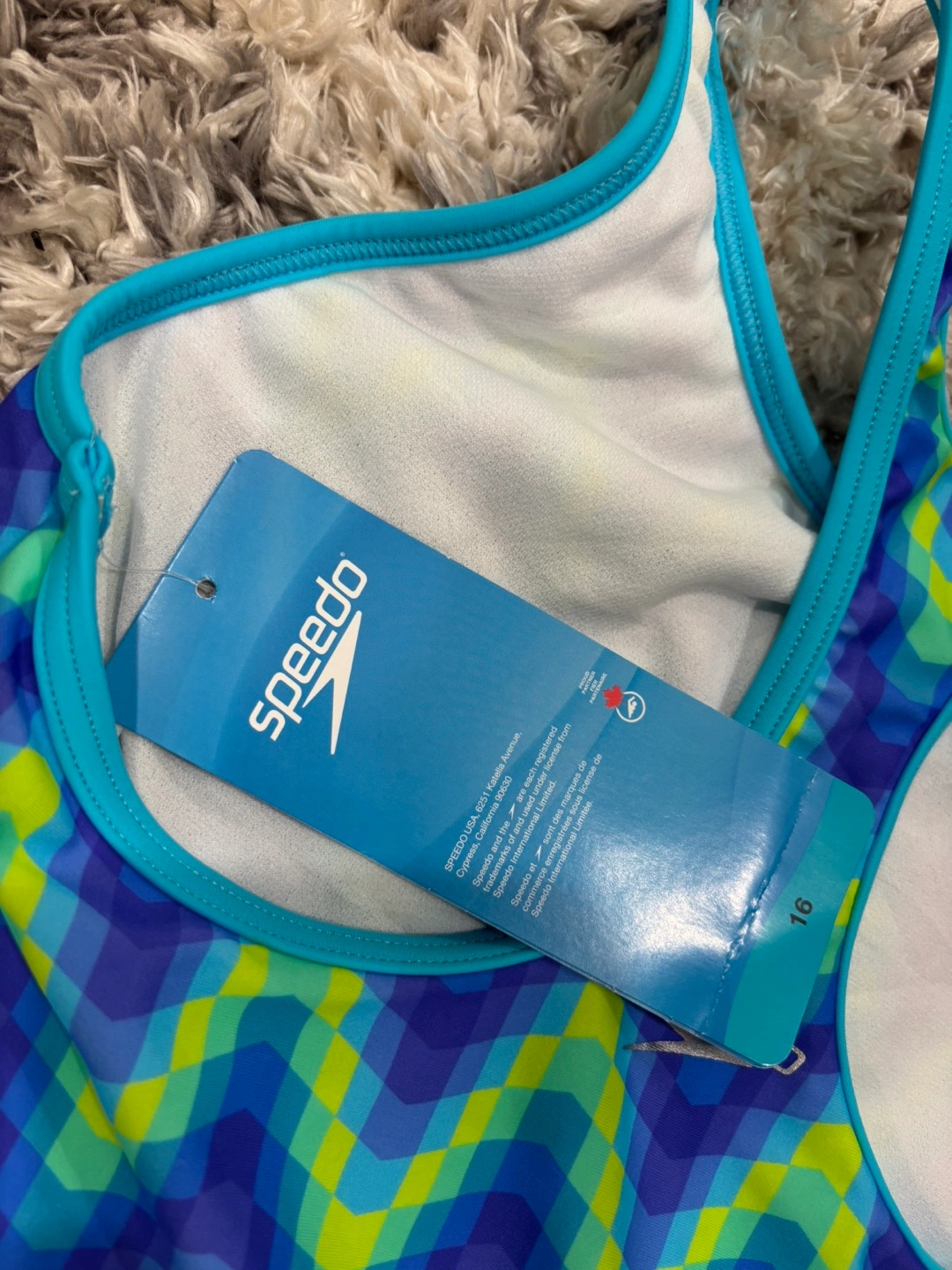 Speedo swimsuit in size 16. - kids size 16 Brand new ! It features a vibrant blue, green, and yellow geometric pattern. Perfect for swimming lessons or a day at the pool!