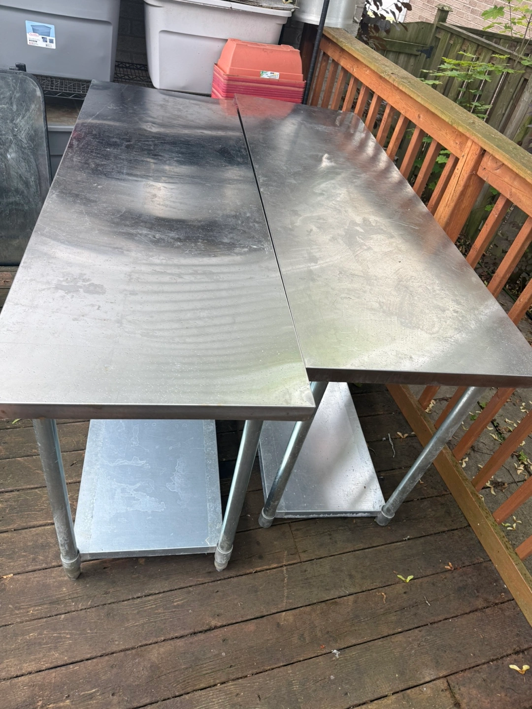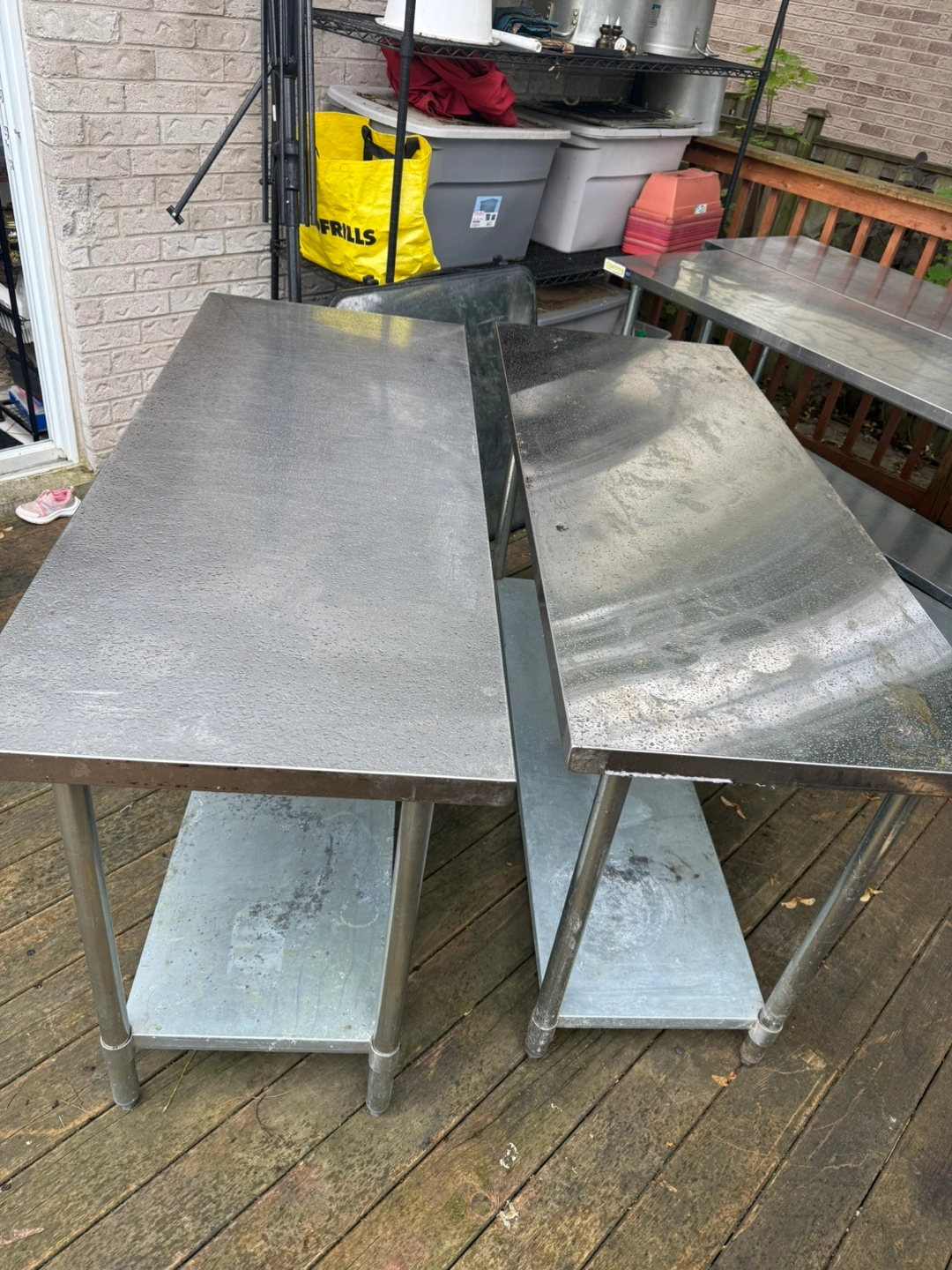 Selling a couple of stainless steel commercial work tables. They're sturdy and perfect for a kitchen or workshop. They show some signs of use, but are still in good working condition! Omega ($150) Nella ($100)