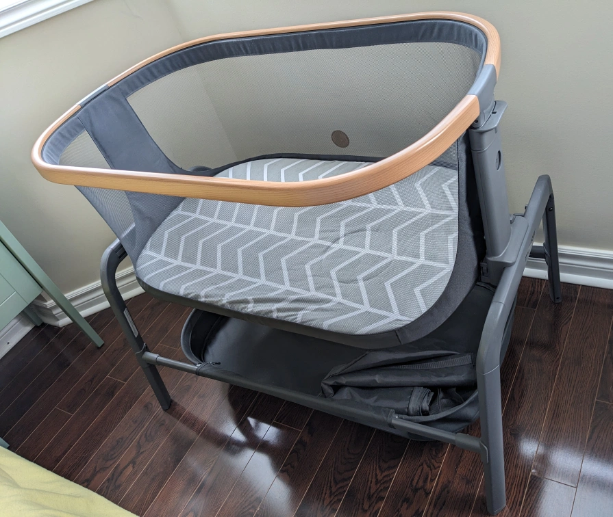 Maxi Cosi Iora Bedside Bassinet Colour: Classic Graphite Purchased for $370 plus tax from Westcoast Kids. Like New/Very Good condition. Barely used as the baby preferred sleeping in bed with us! Throwing in 3 mattress covers that I purchased on Amazon for this bassinet. (One of them on the mattress as pictured) Bassinet Info: Comes with the travel bag 4 Height Positions, 3 Slide Positions Large Storage Basket Folds for easy storage