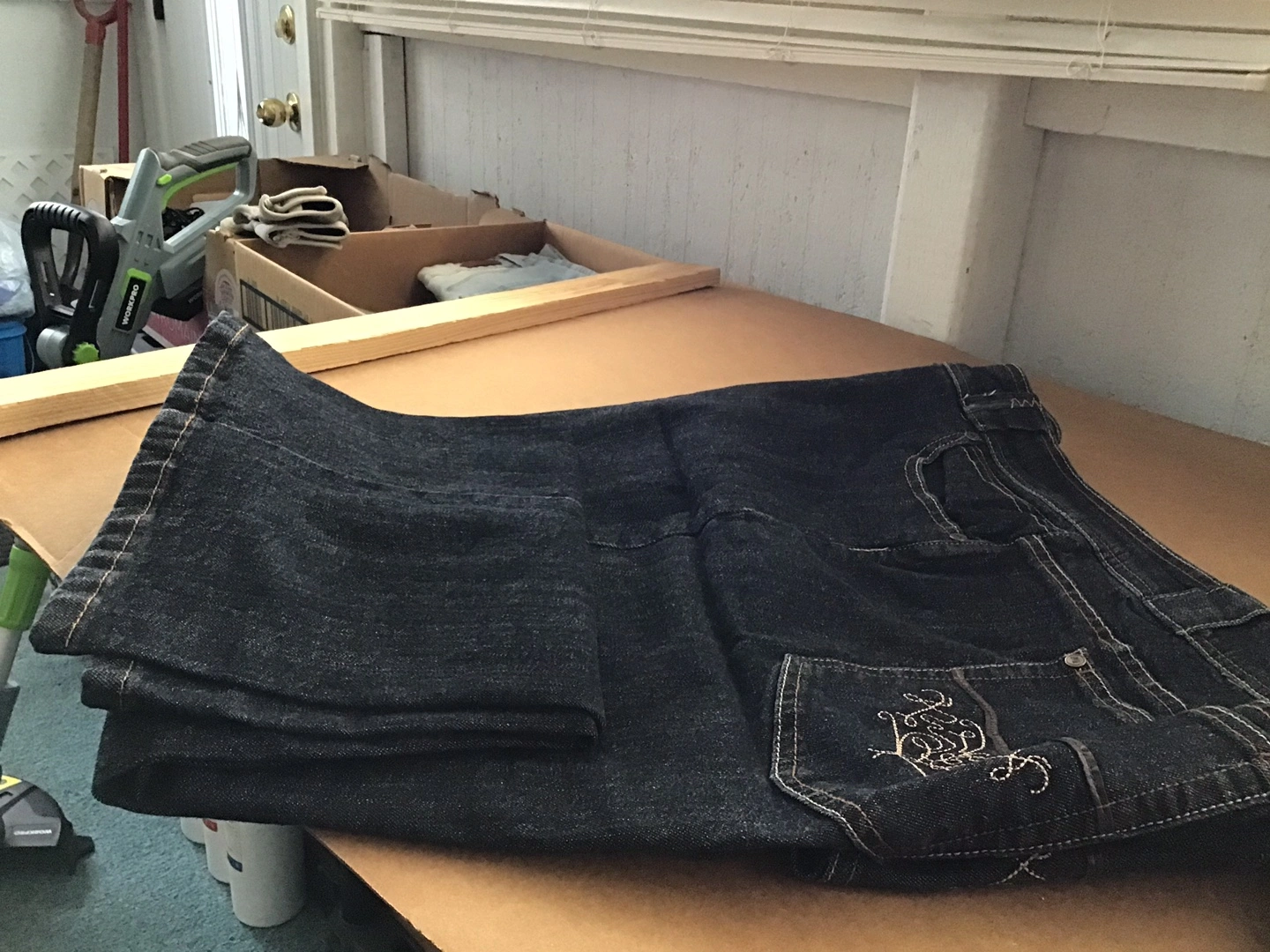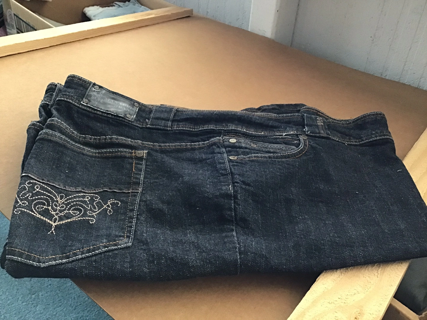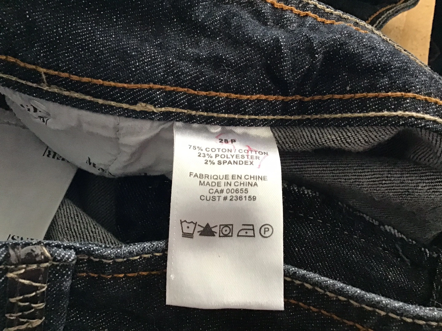 Dark wash Manager jeans in size 28P. The material is 75% cotton, 23% polyester, and 2% spandex. They have a stylish design on the back pocket! They are brand new .paid 80 .need new wardrobe lost weight