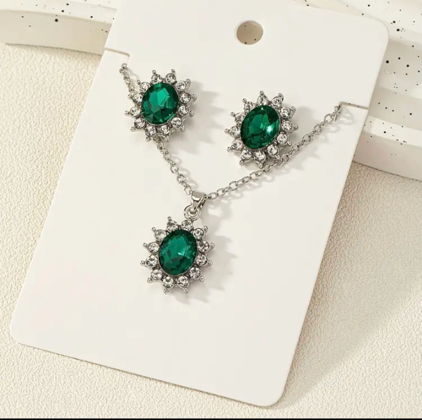 Here's a lovely green necklace and earring set! The stones are set in a silver-tone metal with a delicate chain. Perfect for adding a touch of elegance to any outfit