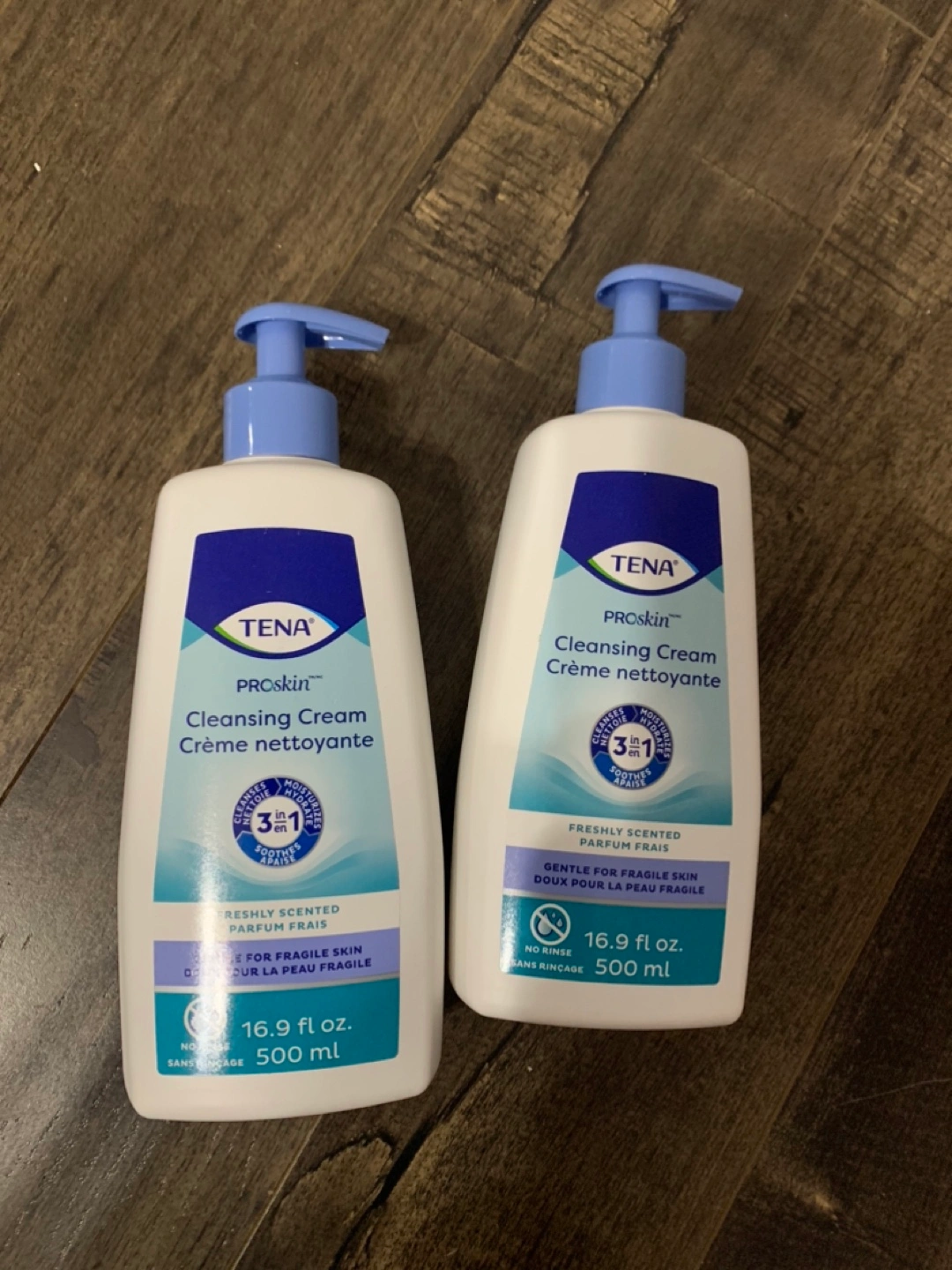 Selling TENA ProSkin Cleansing Cream. It comes in a 500ml bottle and is freshly scented. It is a no rinse product, gentle for fragile skin