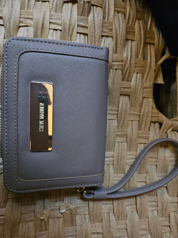 Selling a cute gray Steve Madden wallet! It has a convenient wrist strap and is in good condition. Perfect for keeping your cards and cash organized.
