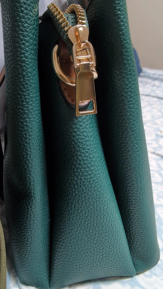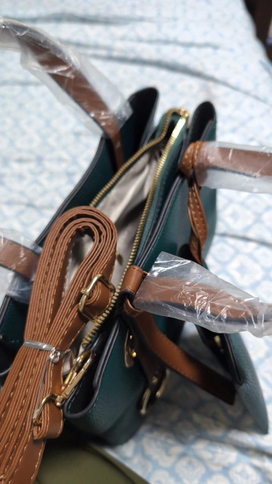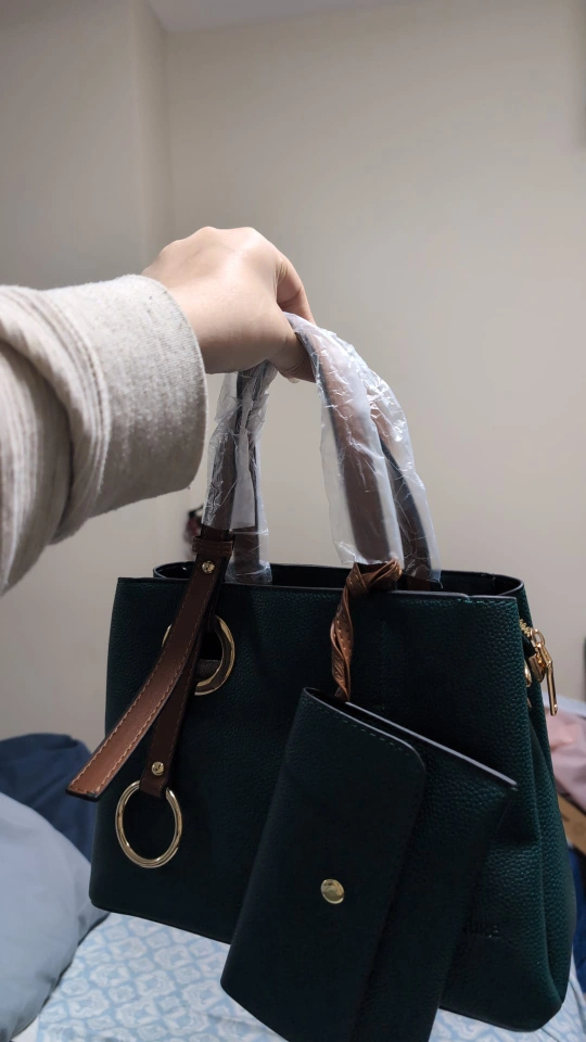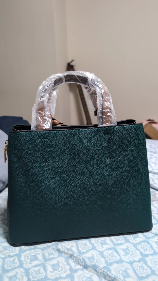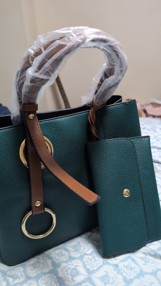 35Brand new tote bag in a beautiful green colour! It comes with a matching wallet and a shoulder strap. The handles are still wrapped in plastic. Perfect for everyday use!