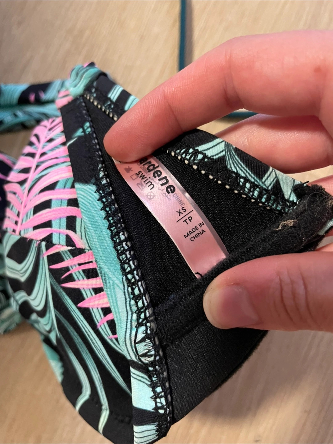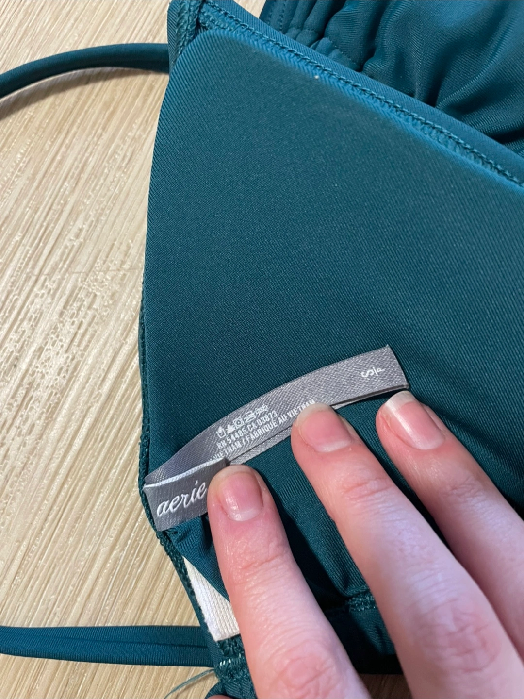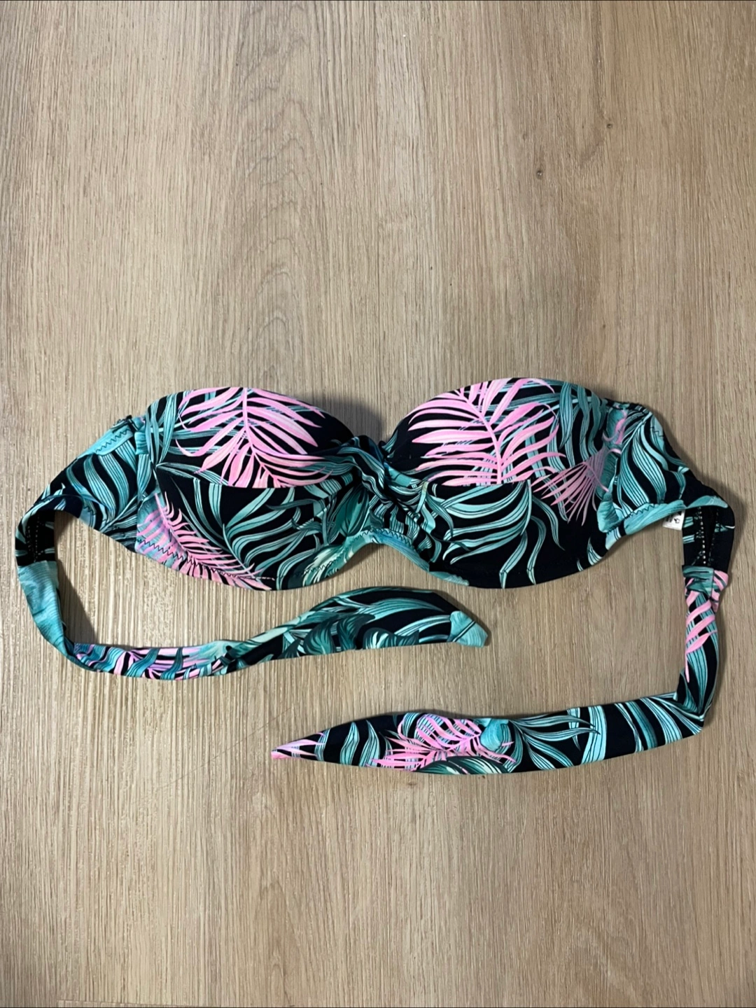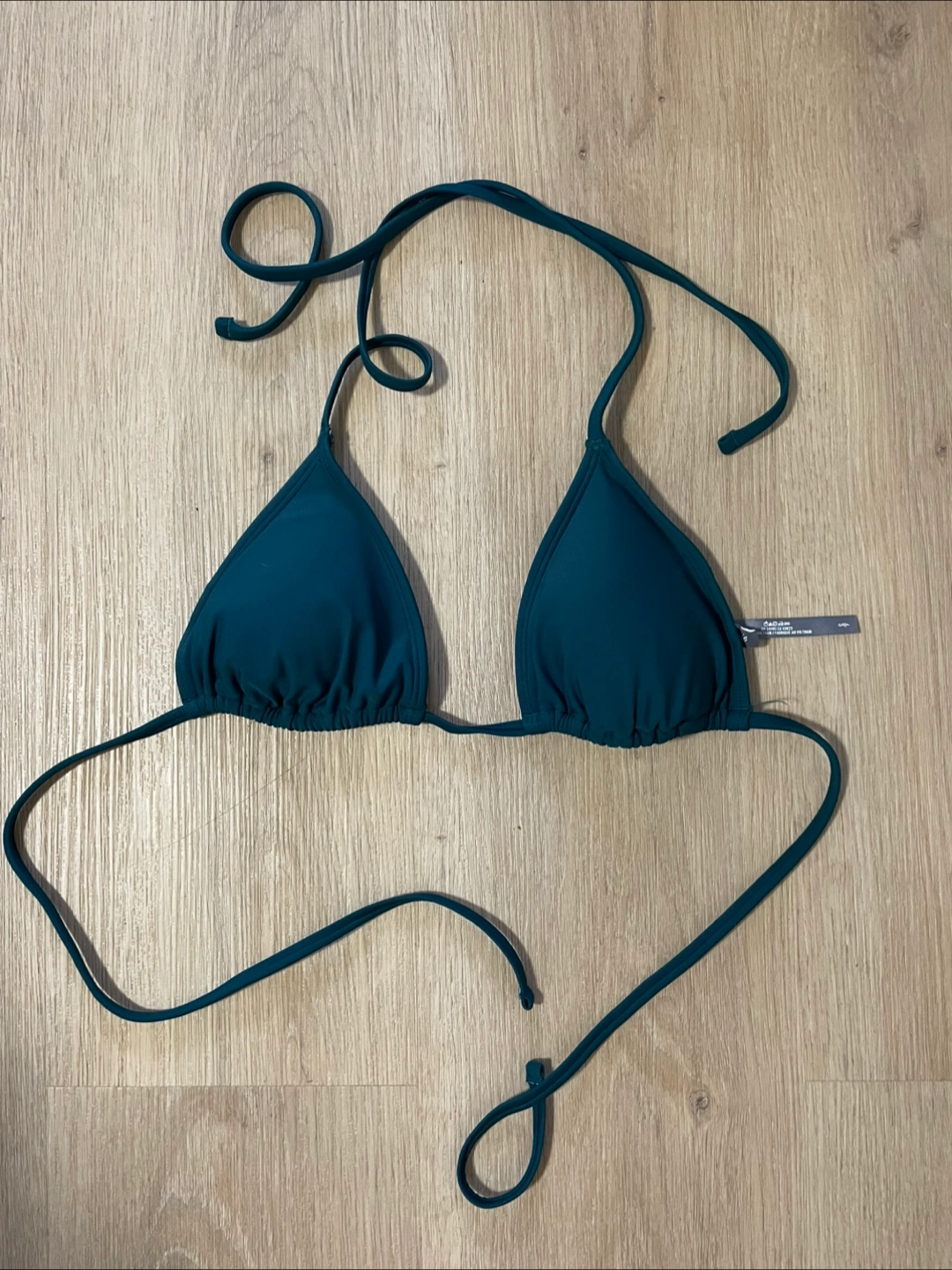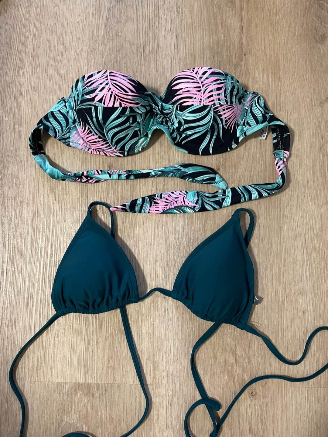 Two cute bikini tops for sale. One is a solid dark green triangle top from Aerie, size small. The other is a bandeau style with a fun tropical print from Ardene, size XS.