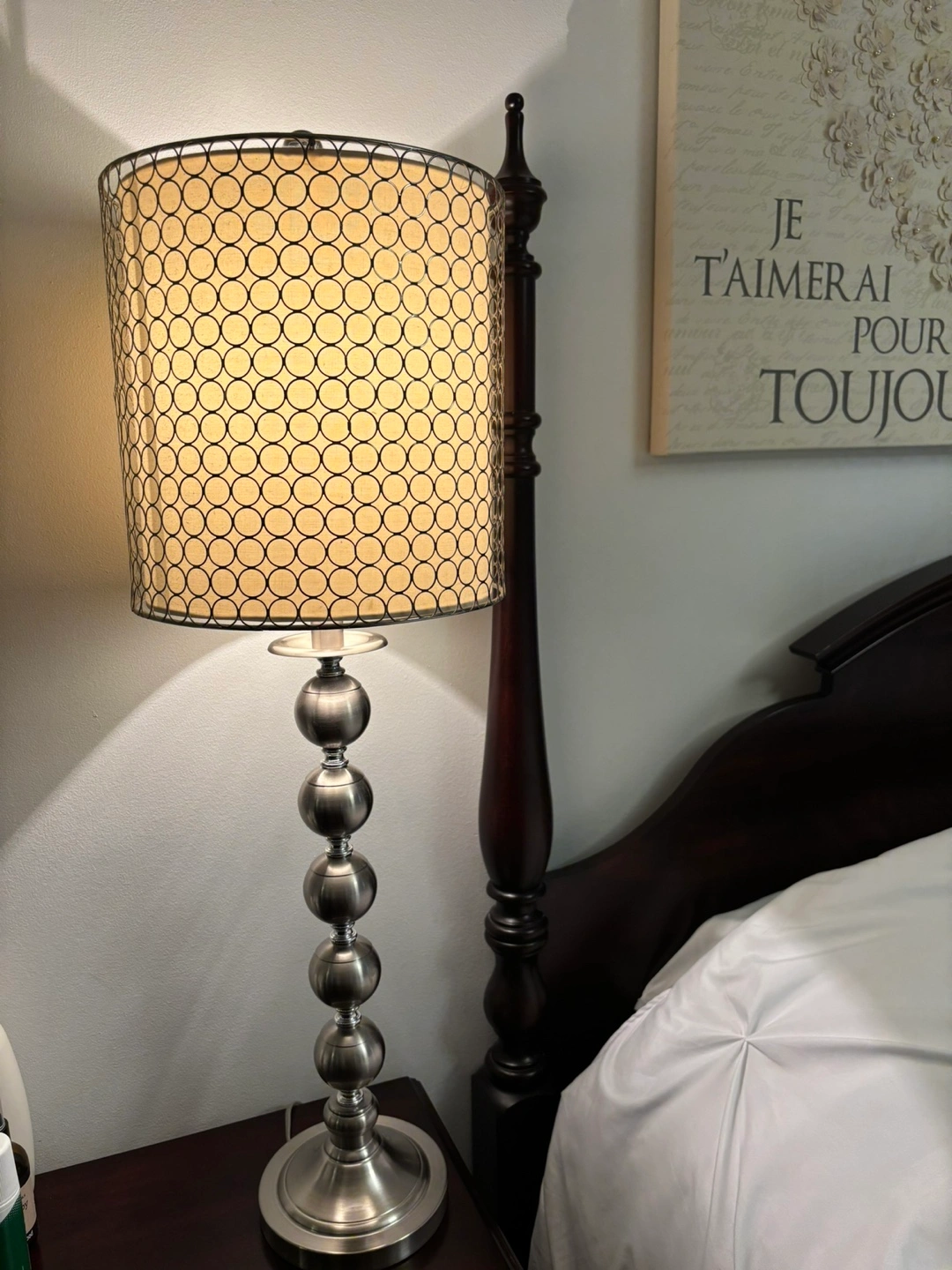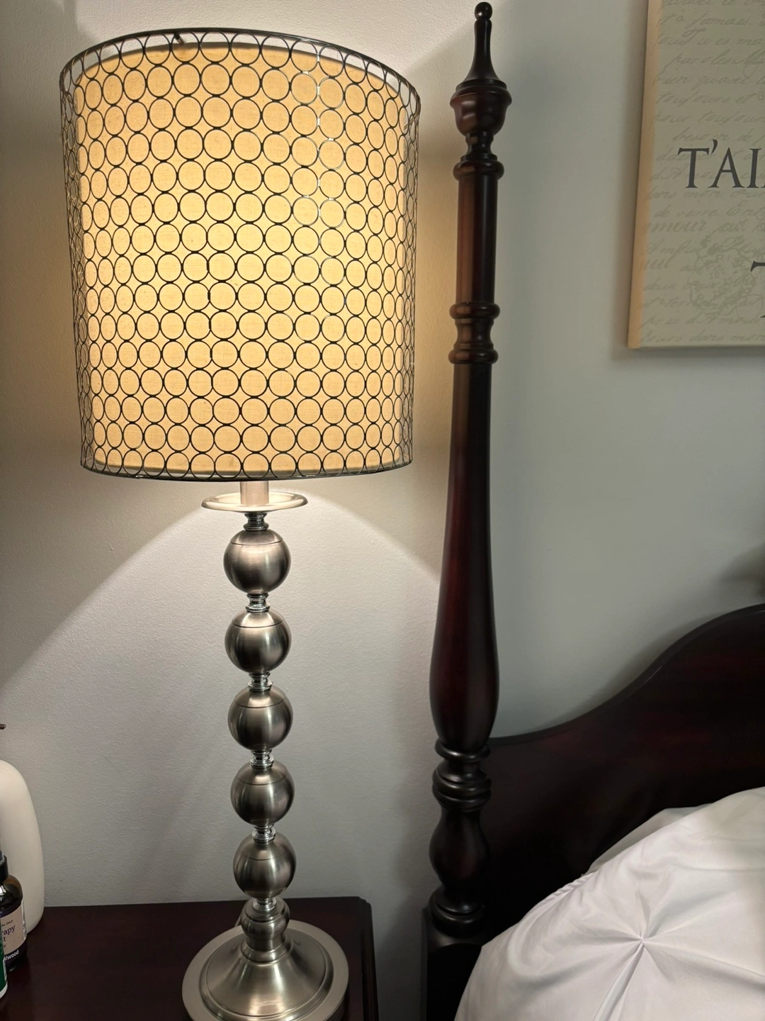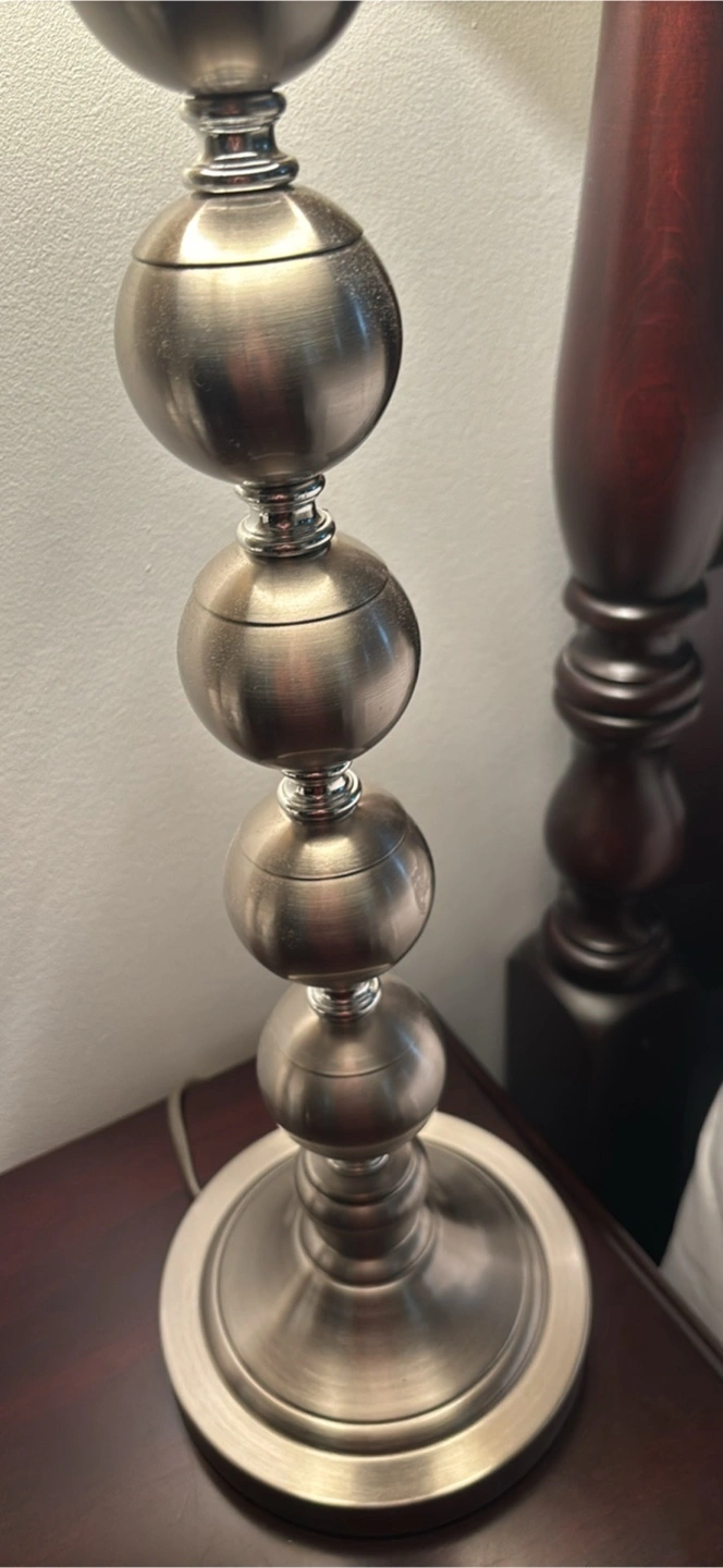 Selling 2 bedside table lamps with a silver finish. It features a unique design with stacked spheres on the base and a patterned lampshade. It's in great condition and would look lovely in any bedroom! 30 inches high. $65 each or take both for $125