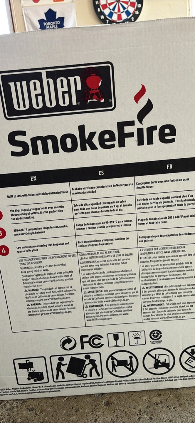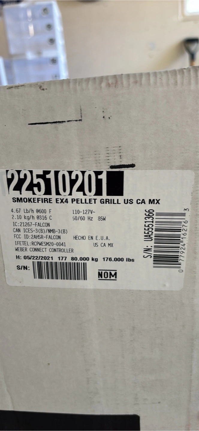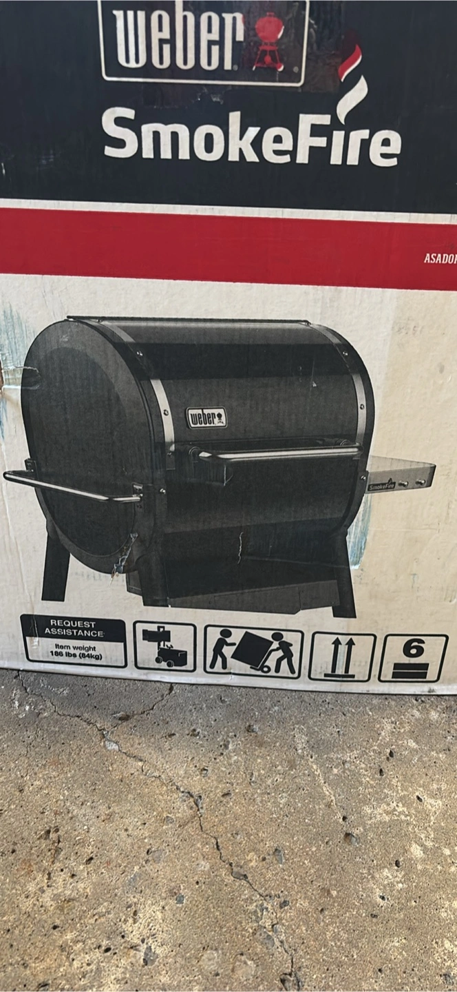 Selling a Weber SmokeFire EX4 pellet grill. It's BRAND NEW IN UNOPENED BOX and ready for your next BBQ! The high capacity hopper holds over an entire 20-pound bag of pellets. The temperature range is 200-600°F.