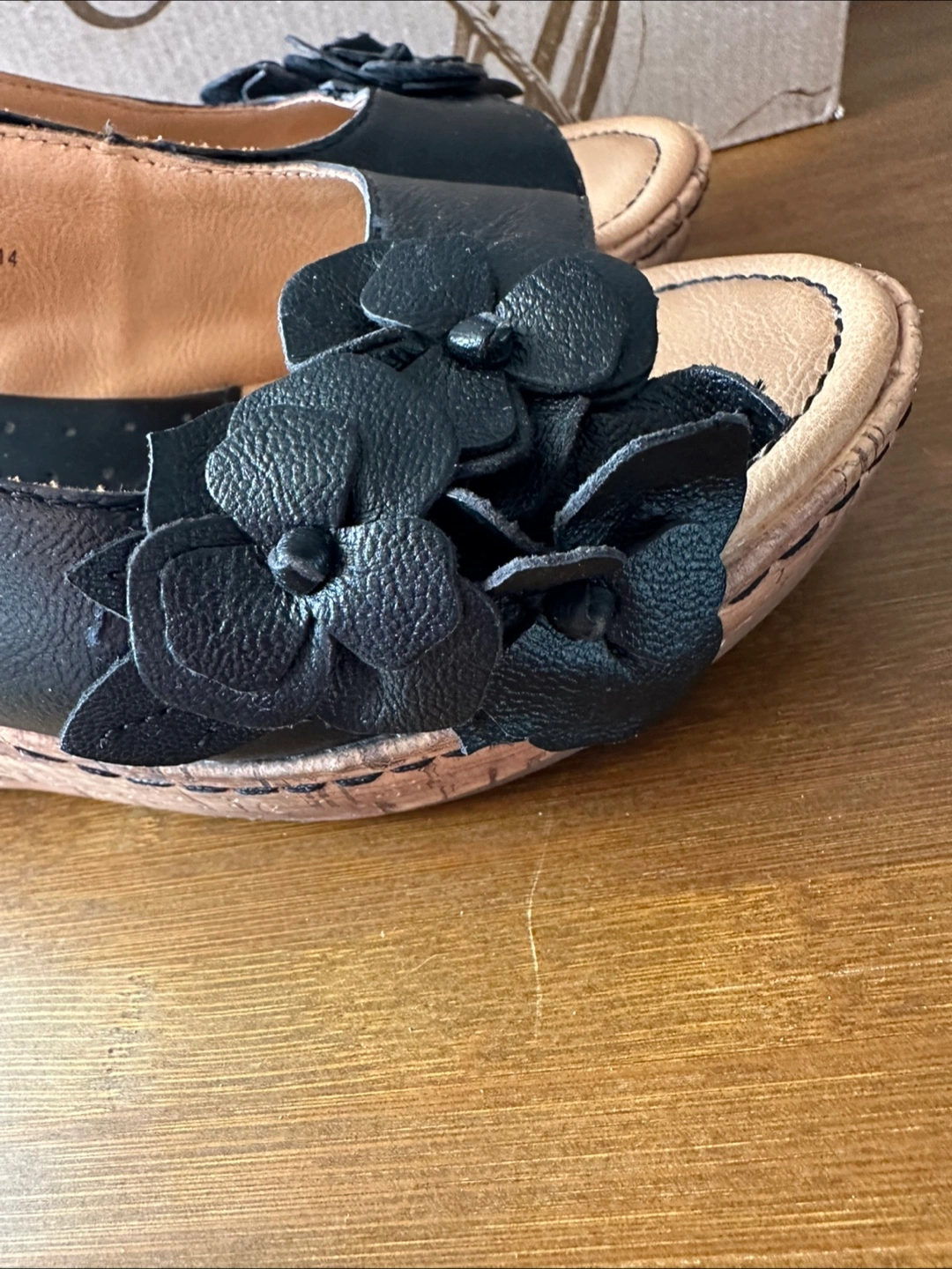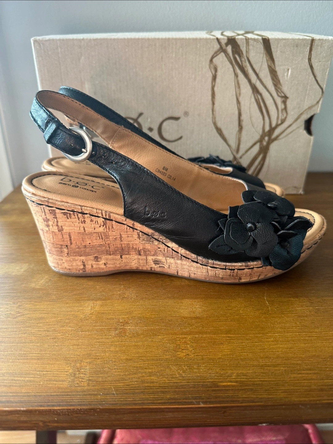 B.O.C. Black Leather Flower Wedge Sandals - Size 8M