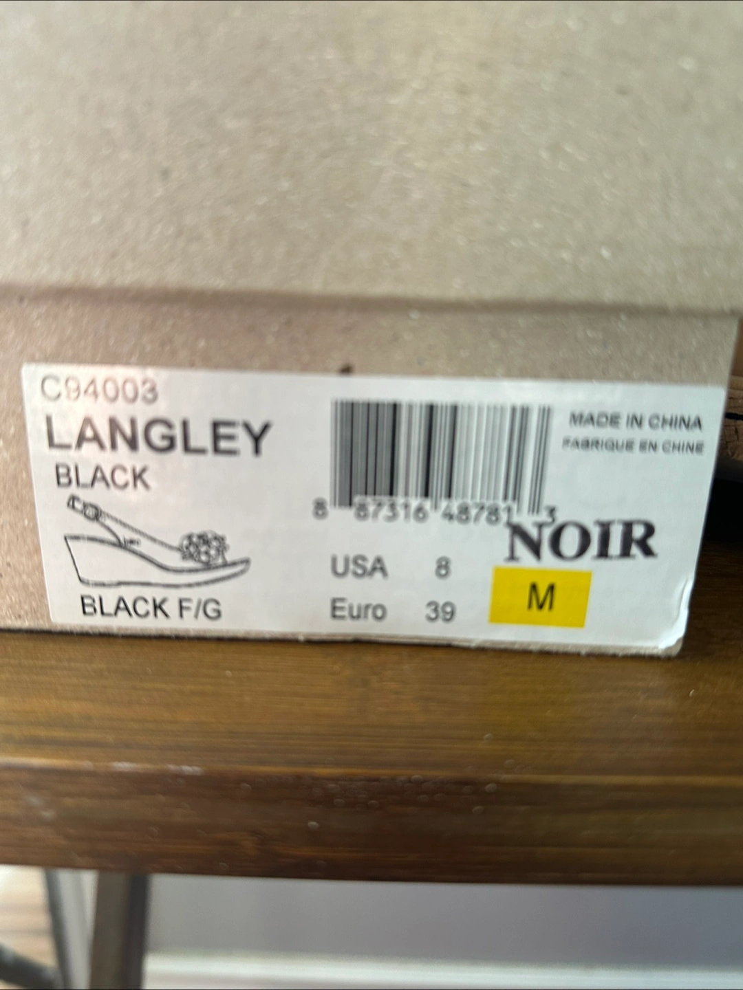 "Langley" Black wedge sandals. Leather upper. Peep toe with floral accents. Size 8. Excellent condition with original box.