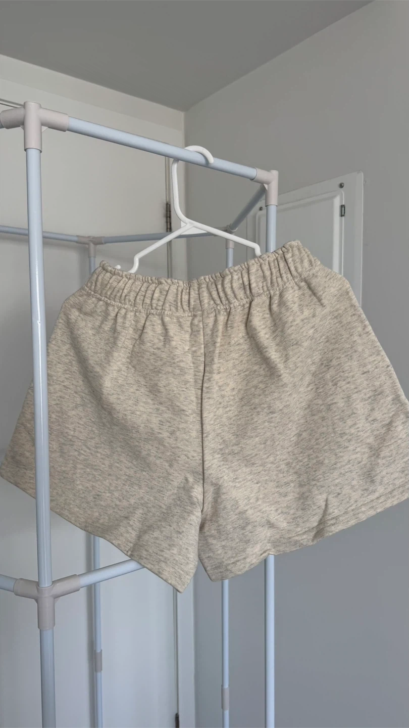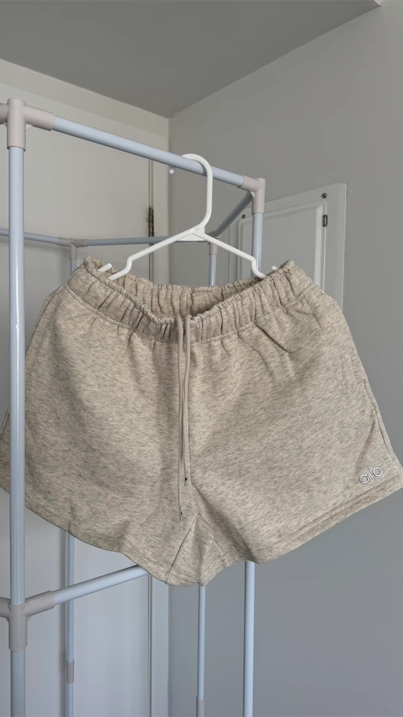 These Alo Yoga sweat shorts are made from a comfortable, heathered fabric. They feature an elastic waistband with a drawstring and a logo detail on the hem. Great for lounging or light workouts!