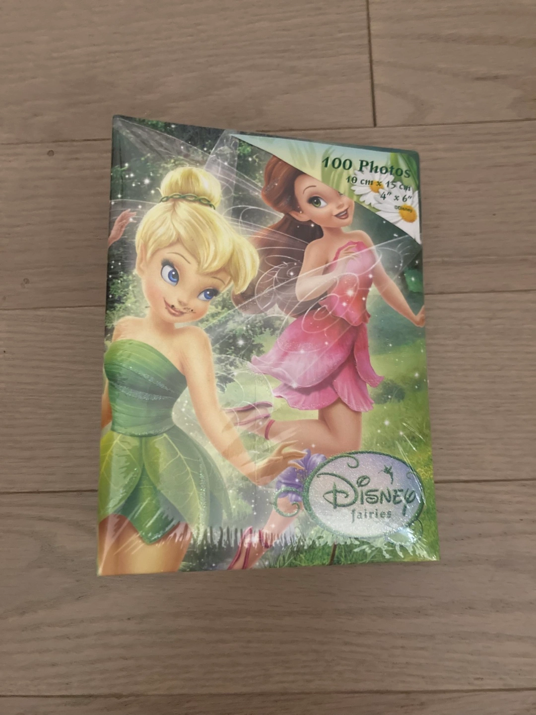 Disney Fairies photo album that holds 100 photos. It's designed for 4" x 6" photos (10 cm x 15 cm). Perfect for keeping your favourite memories safe and organized!