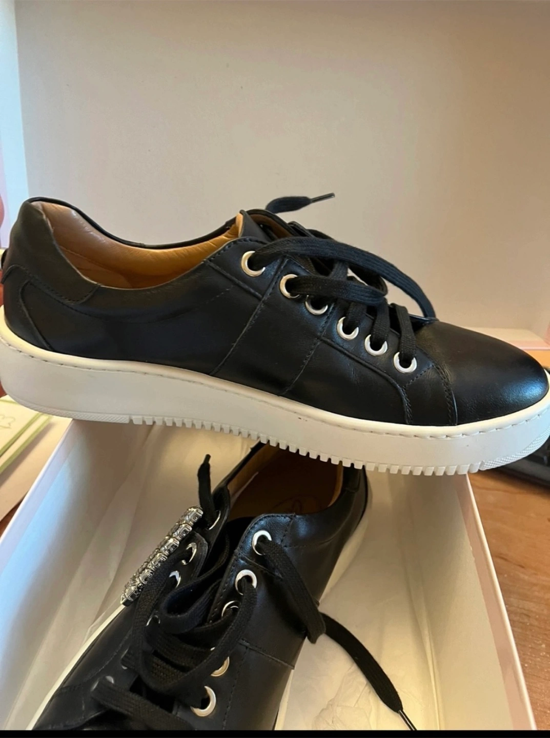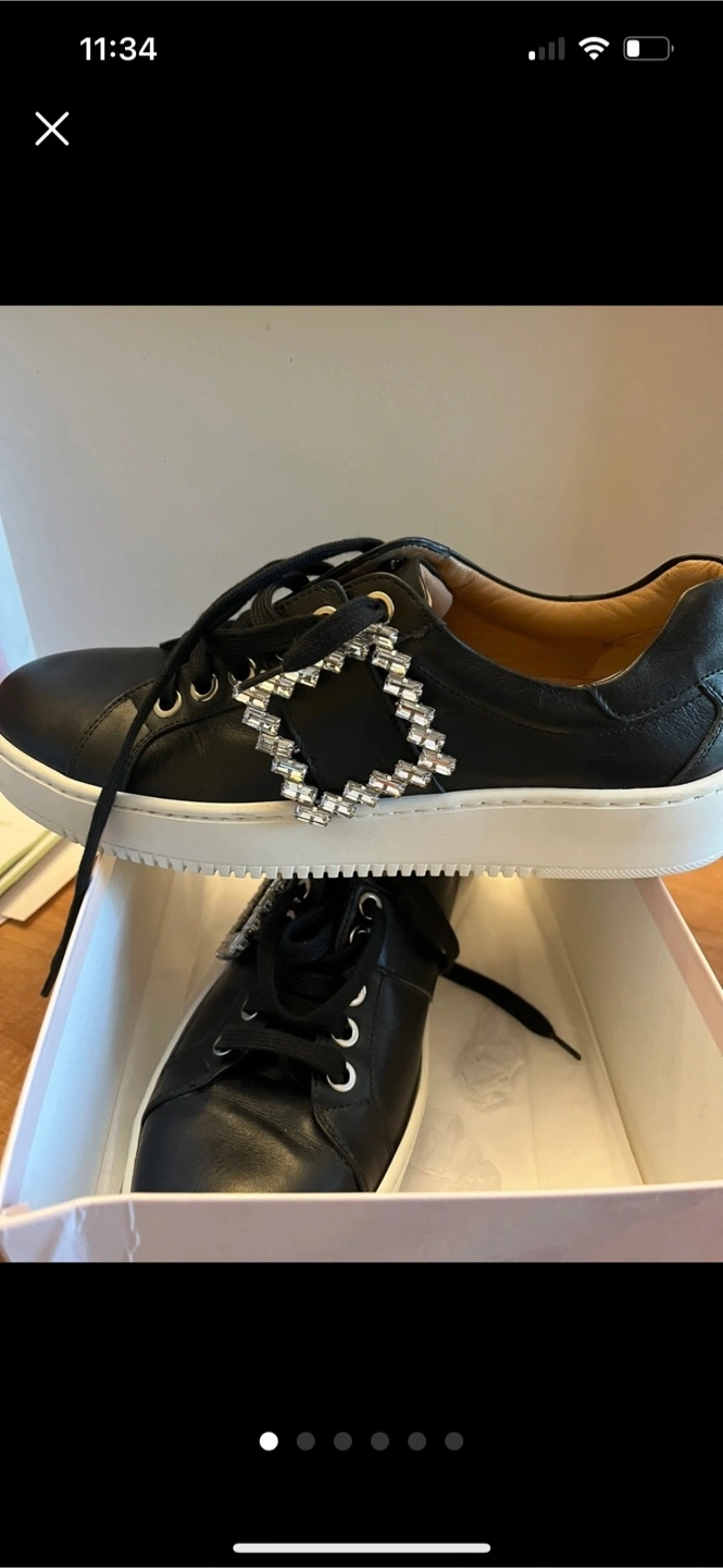 Selling a pair of Browns Couture black leather sneakers! They feature a stylish design with a white platform sole and a decorative jeweled buckle.