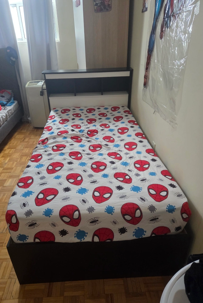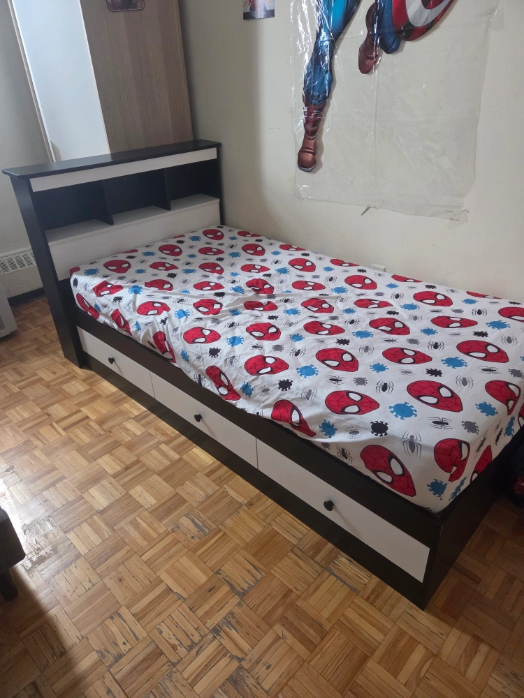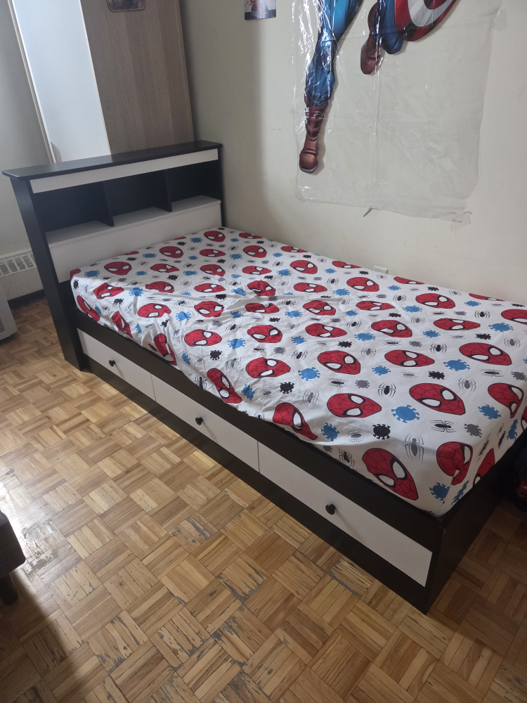 Selling a single size bed frame! It features a headboard with shelving and built-in storage drawers underneath the bed. Perfect for a kid's room or a smaller space