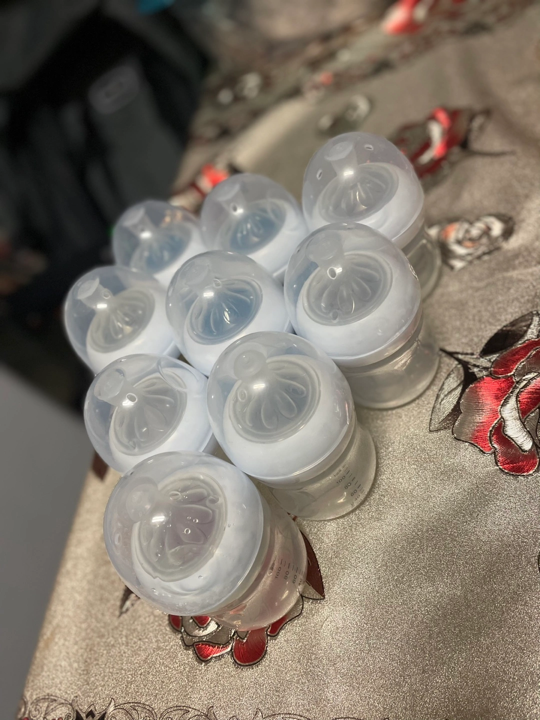 Selling a set of nine Philips Avent baby bottles. They're in great shape and ready for a new home! 8 plastic and 1 glass size 2 teat; selling because my son drinks more than the bottle can hold. only been used about a month and nipples are all fairly new.