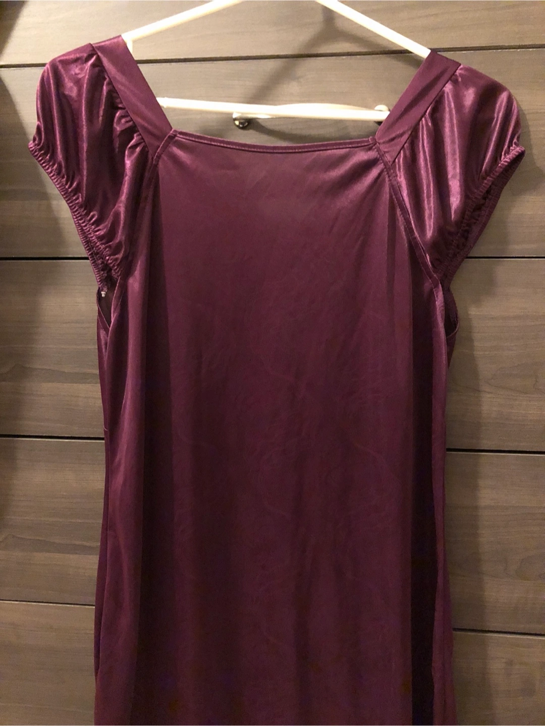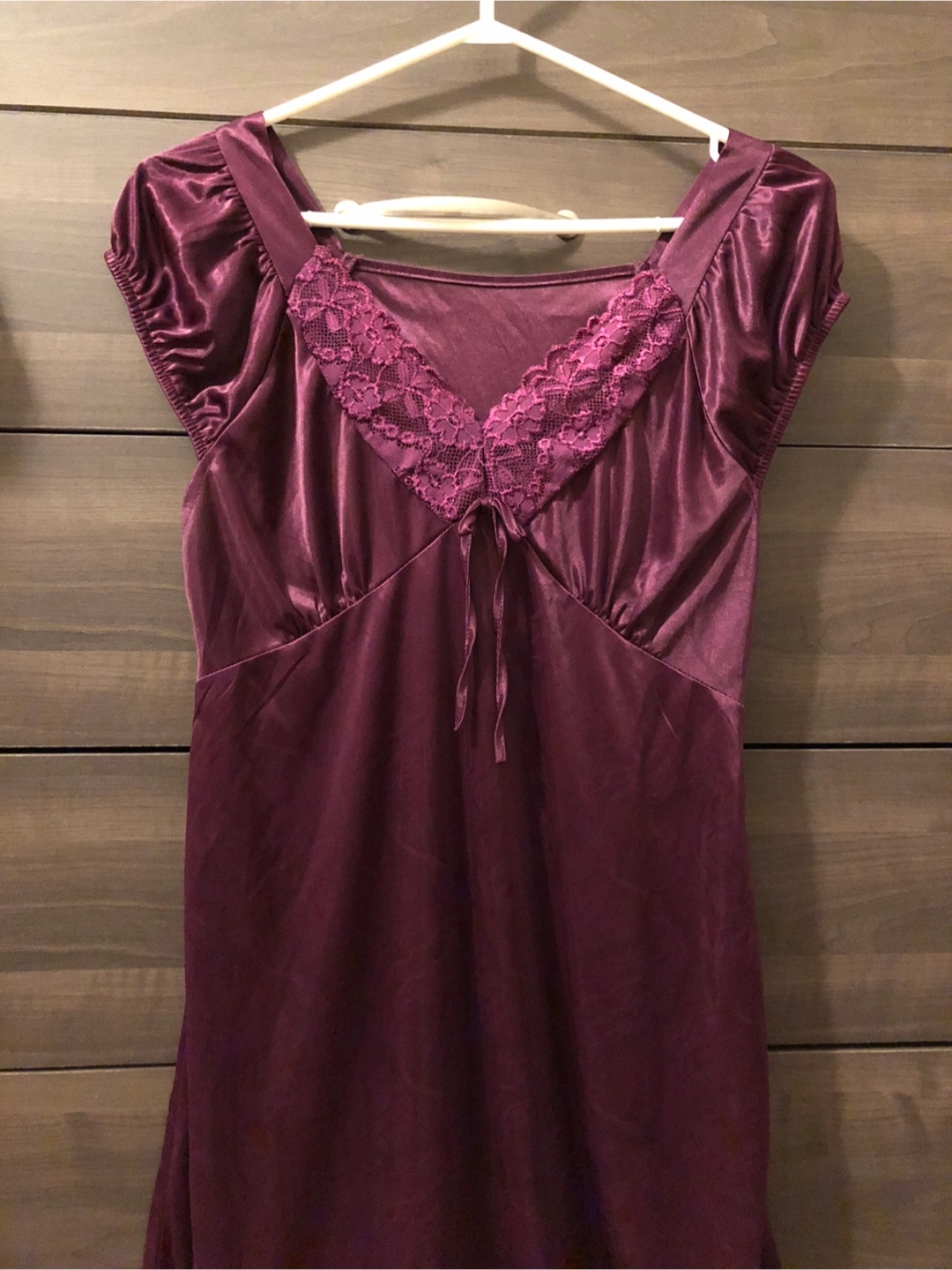 A cute burgundy nightgown with lace detailing around the neckline! It's in great condition and ready for a new home. The material feels soft and comfortable, perfect for a good night's sleep