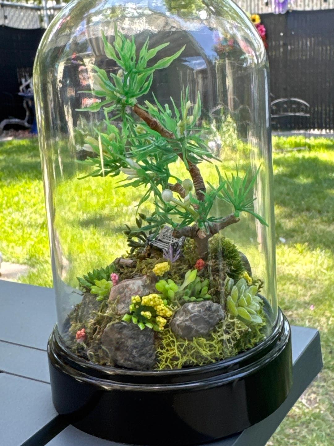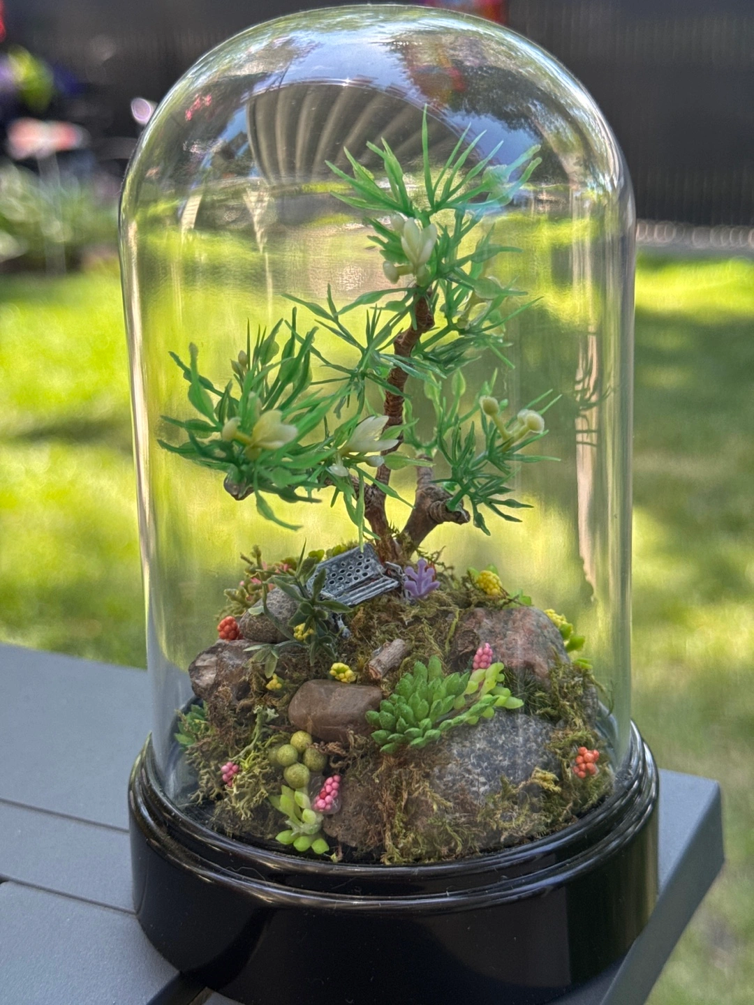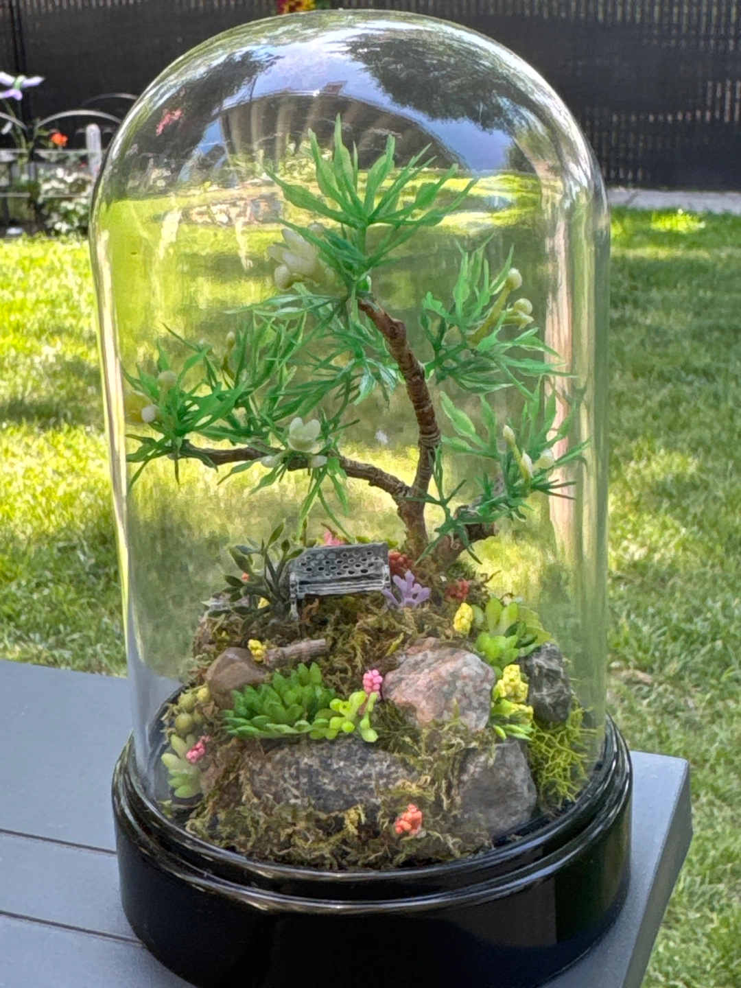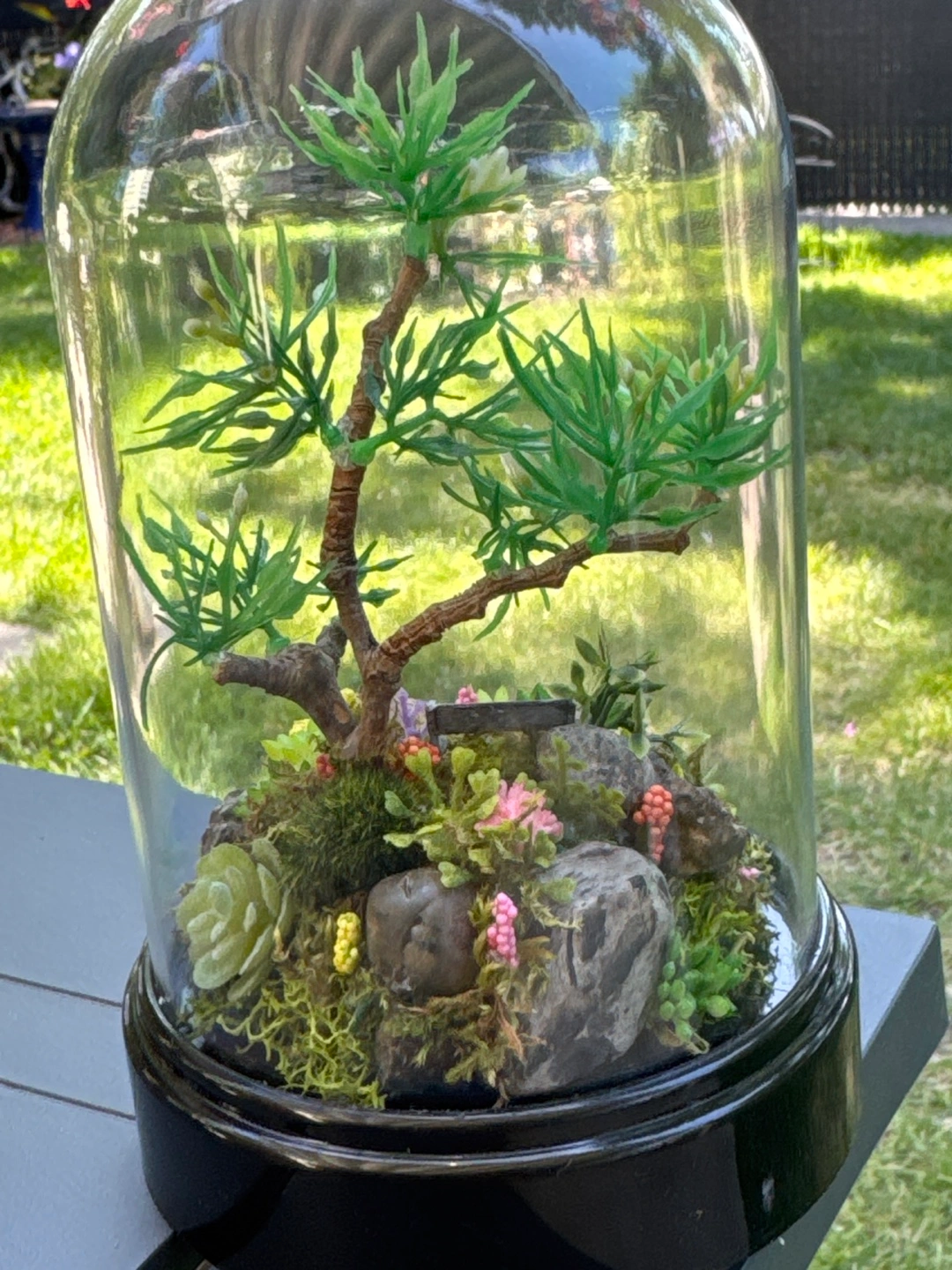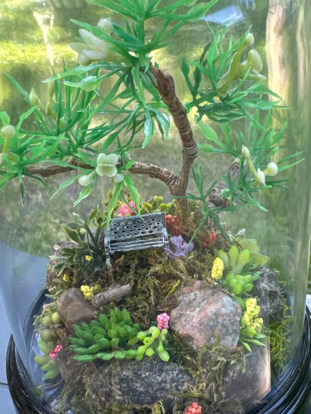 This is a cute little terrarium in a glass dome. It has a little bench, rocks, moss, and plants inside. It would be a nice addition to any room!