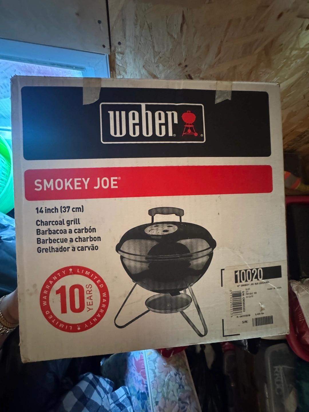 Selling a brand new, in-box Weber Smokey Joe 14-inch charcoal grill! This portable BBQ is perfect for small spaces or taking on the go. It comes with a 10-year limited warranty, so you can be sure it's built to last. Get ready for some delicious grilling!