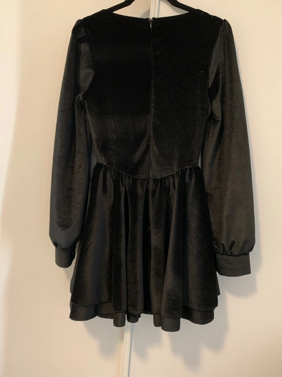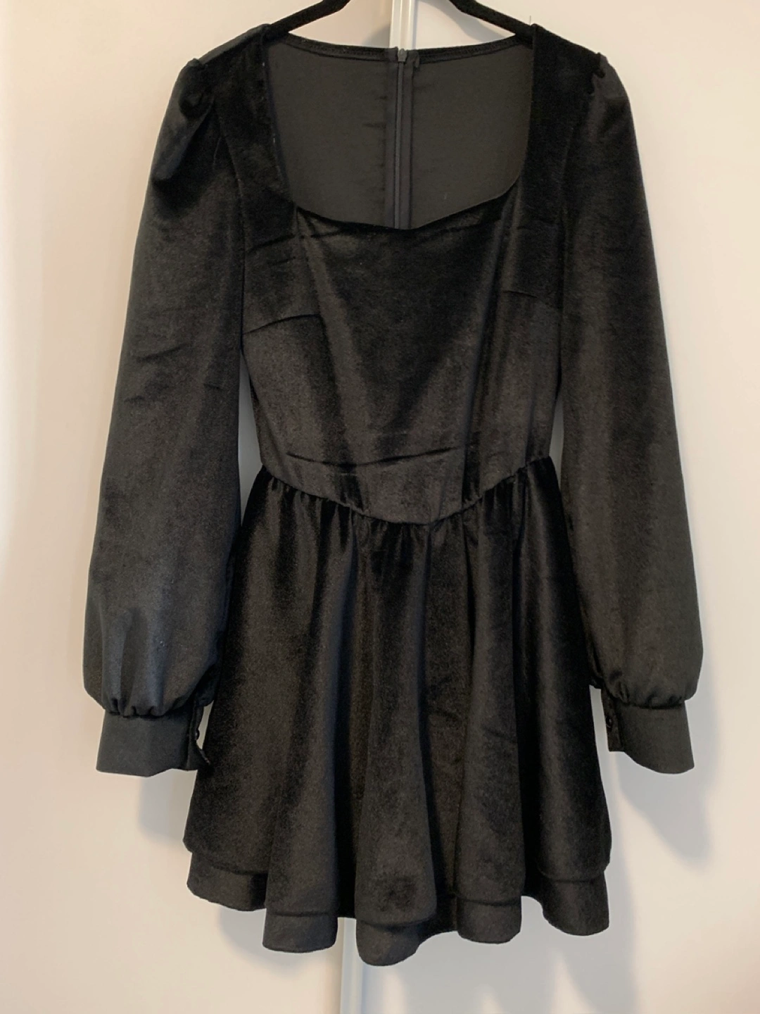 Selling a cute black velvet mini dress! It's in great condition and perfect for a night out or a special occasion. The dress features a square neckline and long sleeves, giving it a stylish and elegant look. The soft velvet material adds a touch of luxury and comfort