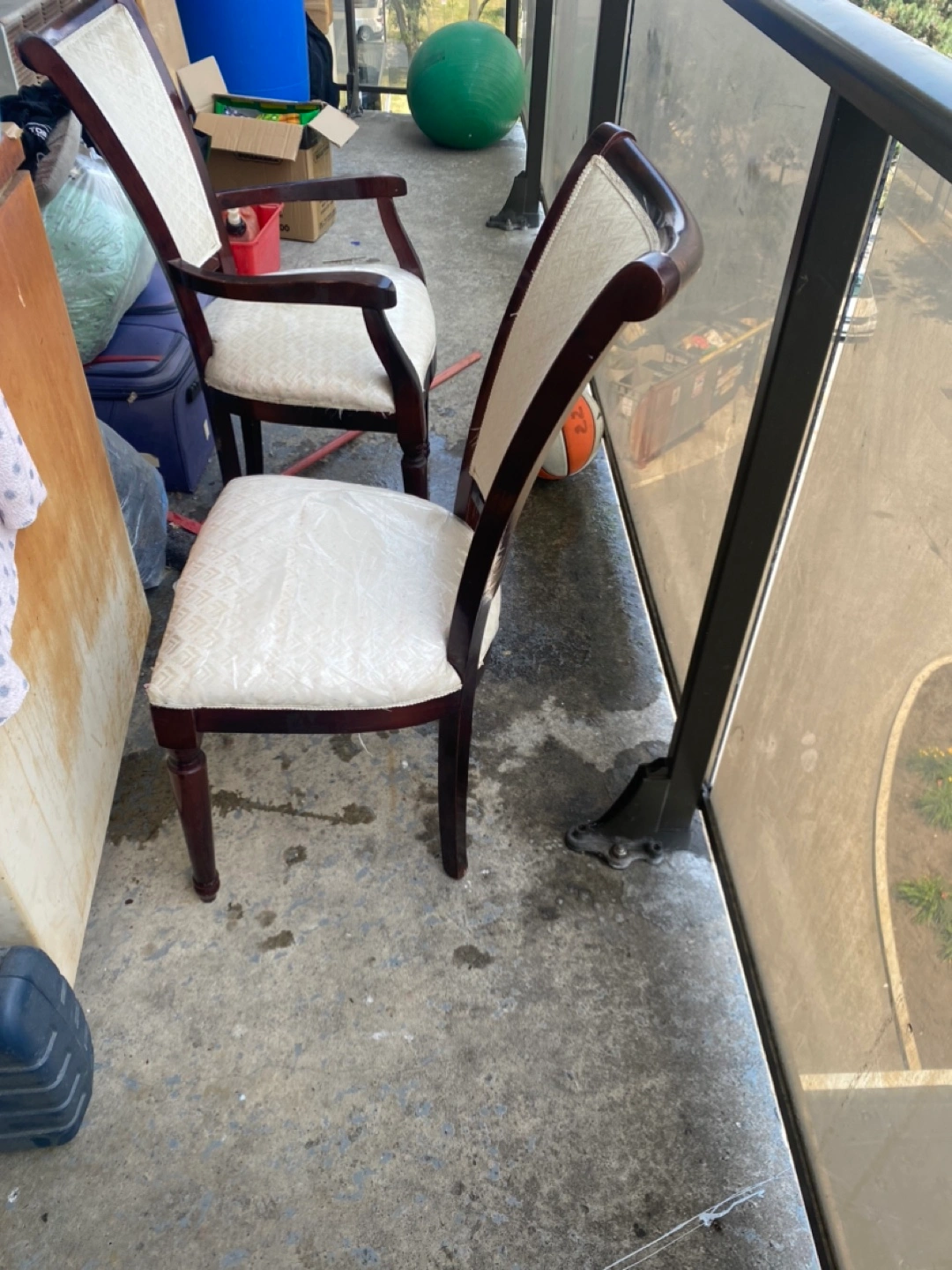 Selling a set of two elegant dining chairs. They feature a dark wood frame and cream-coloured patterned upholstery. Perfect for adding a touch of class to your dining area!