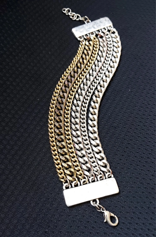 This is a beautiful multi-strand chain bracelet! It features both gold and silver-toned chains, giving it a unique and stylish look. It's in great condition and ready to add some flair to your outfit