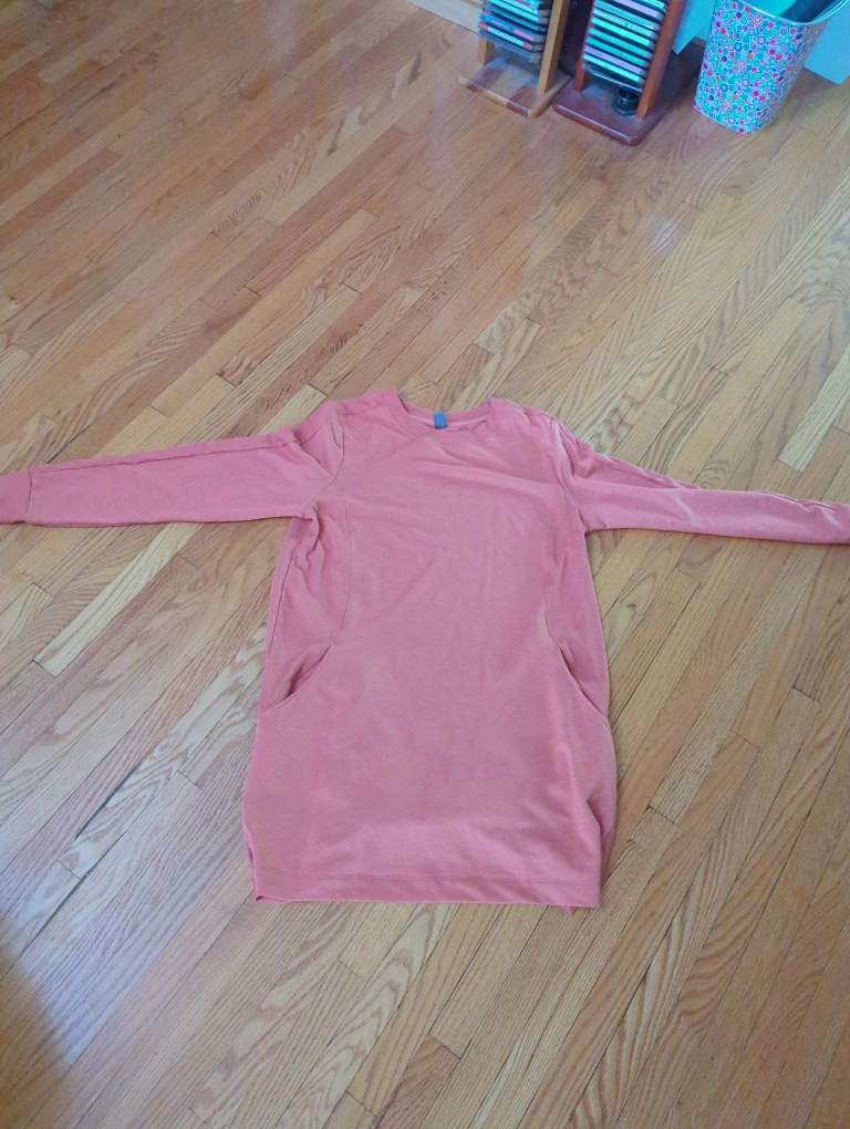 A comfy long sleeve tunic top in a lovely coral colour! It has a relaxed fit and handy pockets on the front.