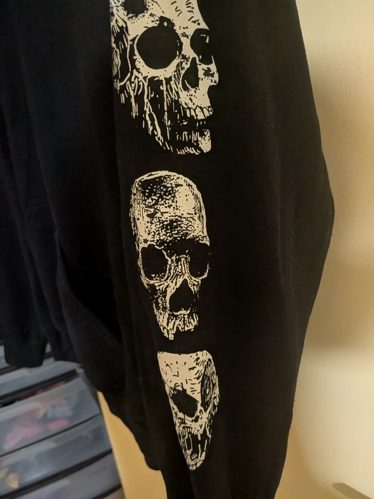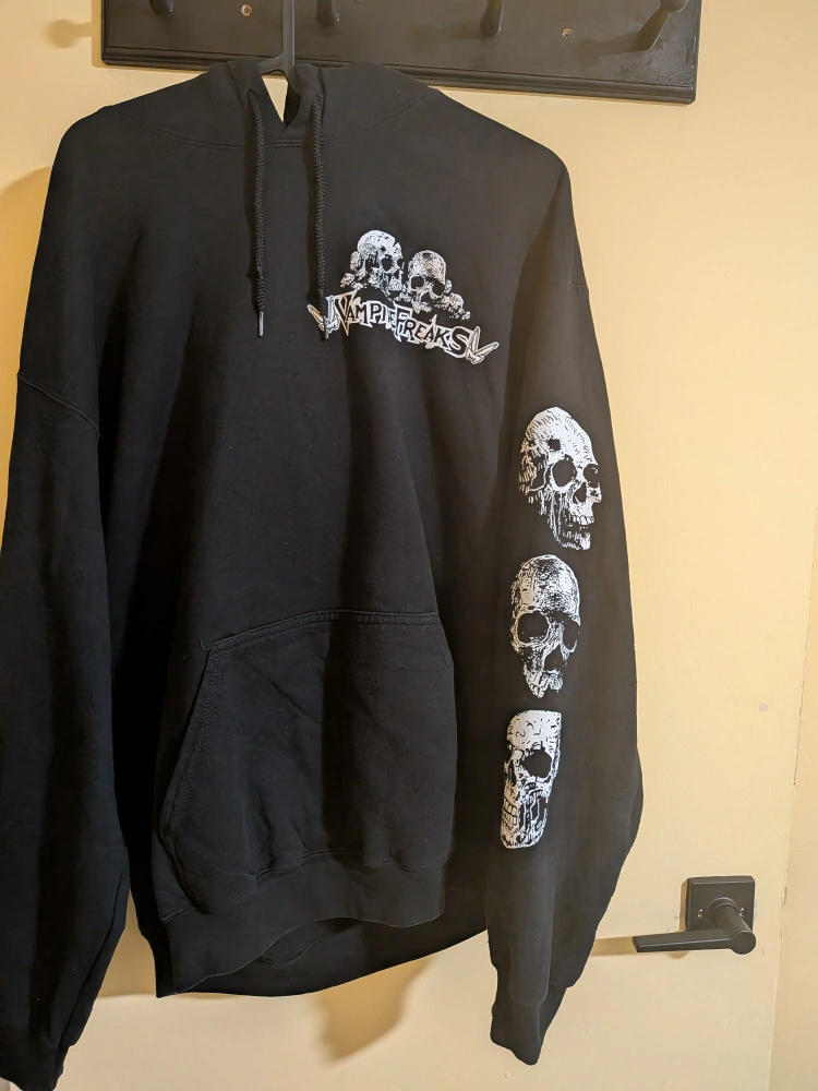 Selling a Vampire Freaks hoodie in size large. It's black with a cool dragon and skulls design on the back and more skulls down the sleeve. Made of 50% cotton and 50% polyester. Good condition