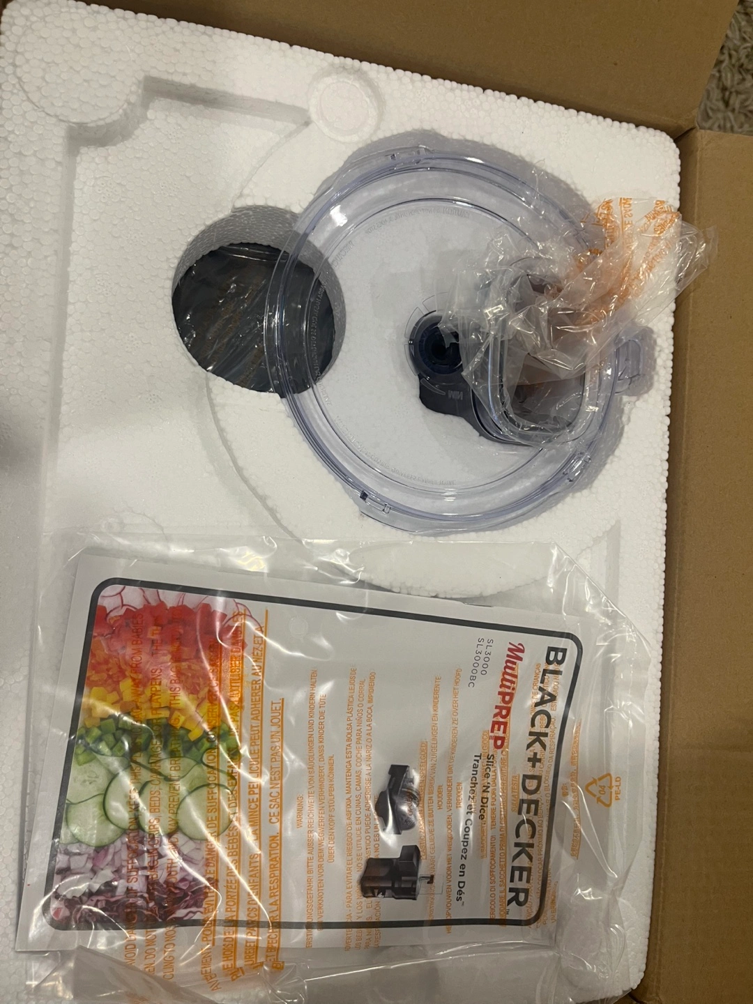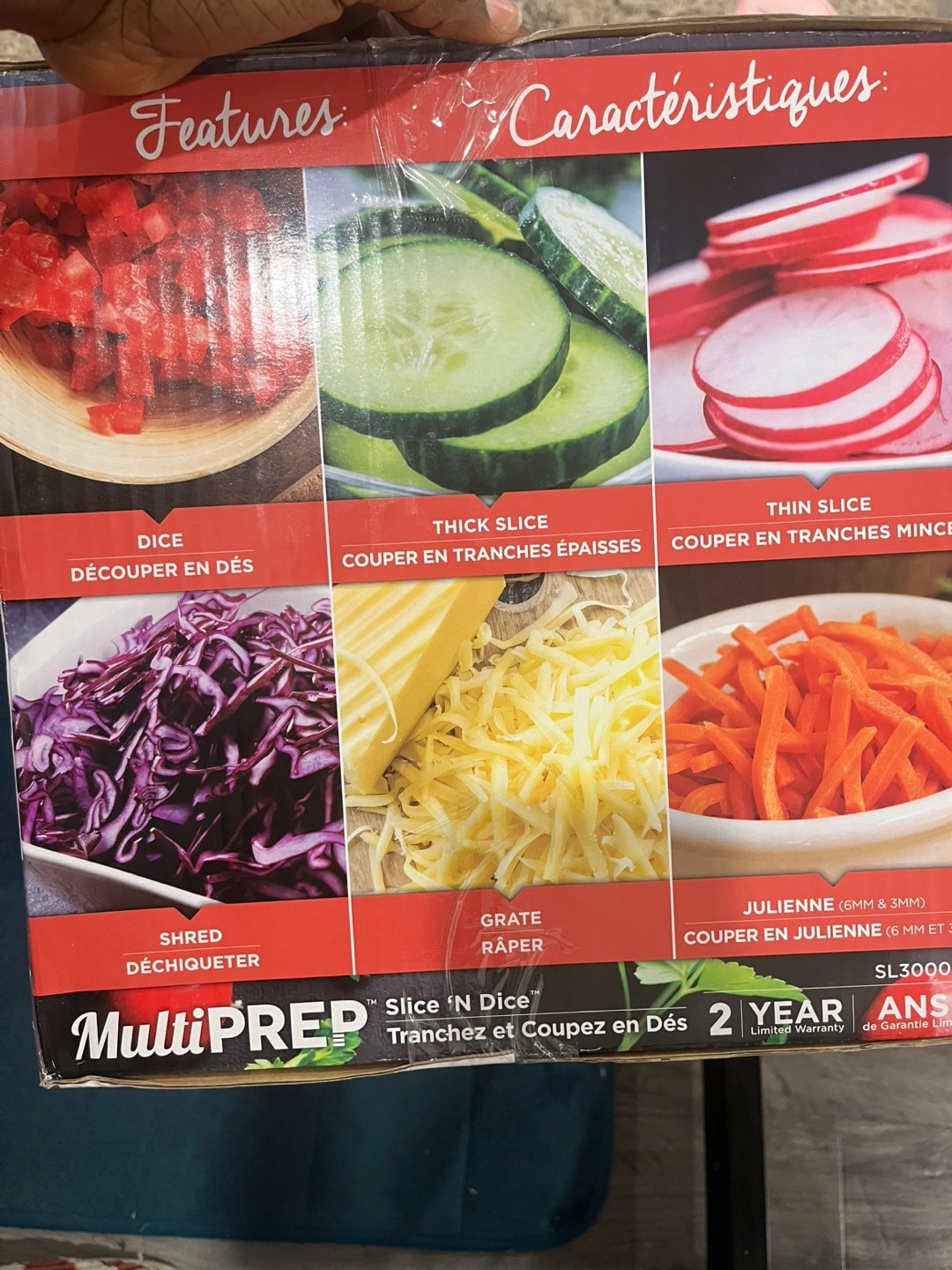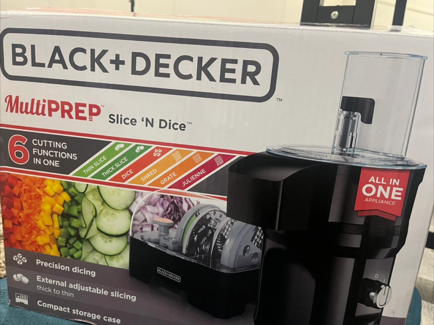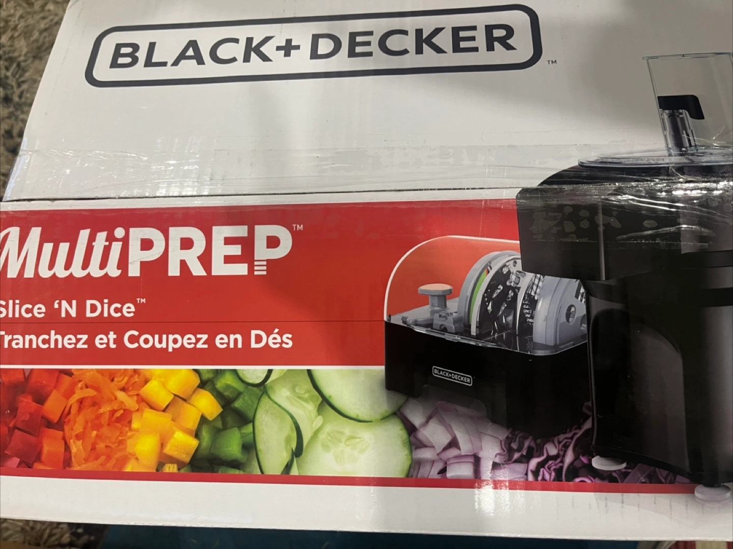 142I'm selling a brand new Black+Decker MultiPrep Slice 'N Dice food processor! It comes with the box and all the original components. This all-in-one appliance has 6 cutting functions, including thin slice, thick slice, dice, shred, grate, and julienne. It features external adjustable slicing from thick to thin and has a compact storage case.