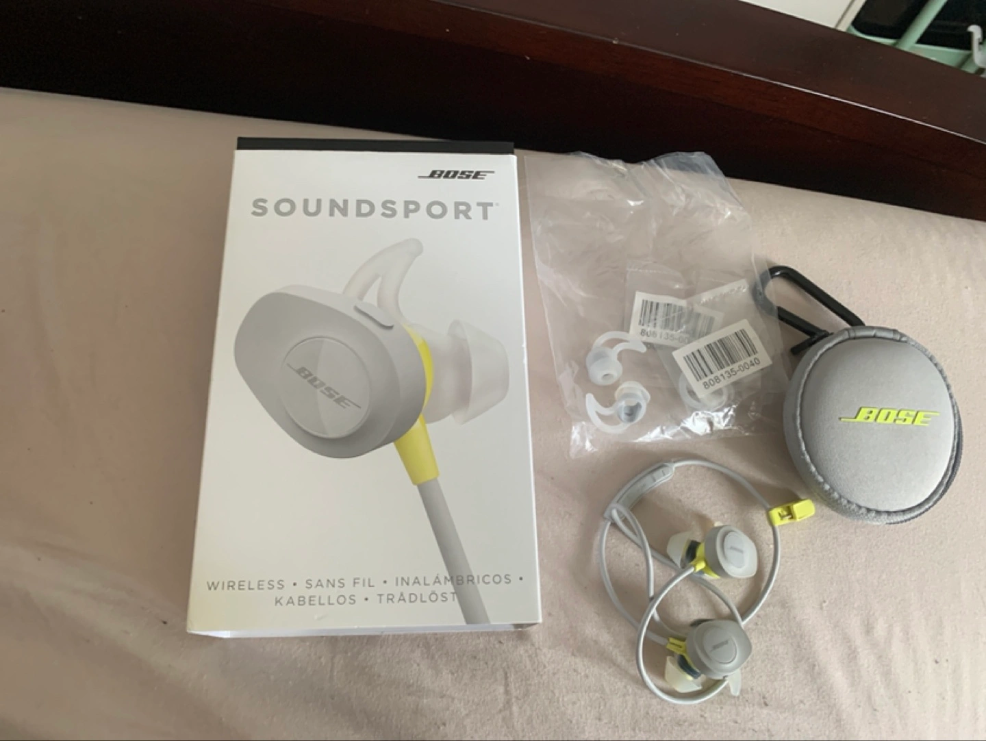 Selling a pair of Bose Soundsport wireless earbuds! These come with the original box and a carrying case. Also included are extra ear tips to ensure a comfortable fit. They're perfect for workouts or everyday use!
