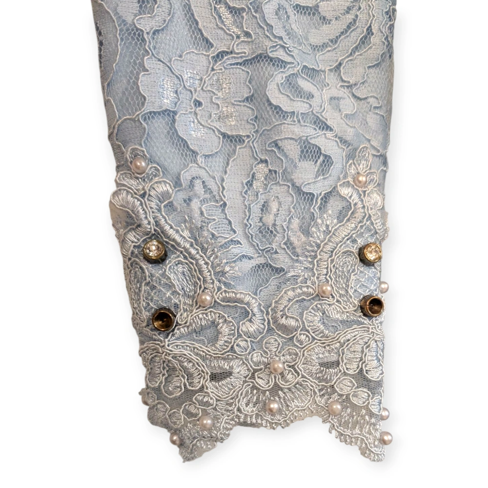 This is a beautiful, light blue maxi dress with long sleeves. It features delicate lace detailing on the bodice and sleeves, adorned with subtle pearl and gem accents. The dress flows gracefully to the floor, making it perfect for a special occasion.