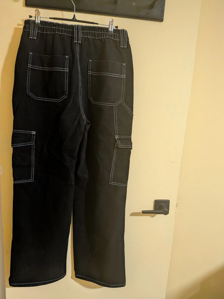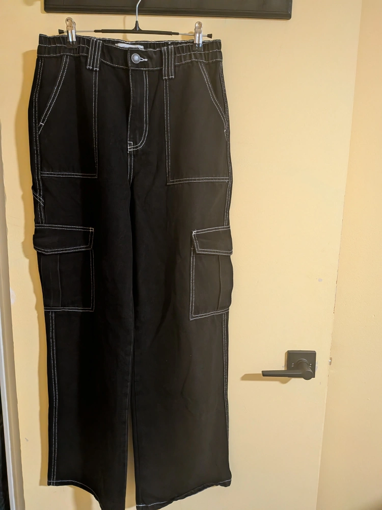 118Selling a pair of Ardene black wide leg cargo pants in size small. Two pockets on the top and thighs and two pockets on the back. Good condition