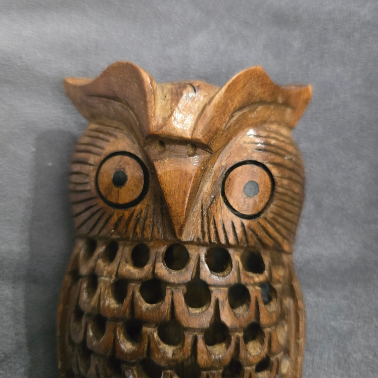 Selling a charming wooden owl figurine. It's intricately carved and would make a lovely addition to any home decor