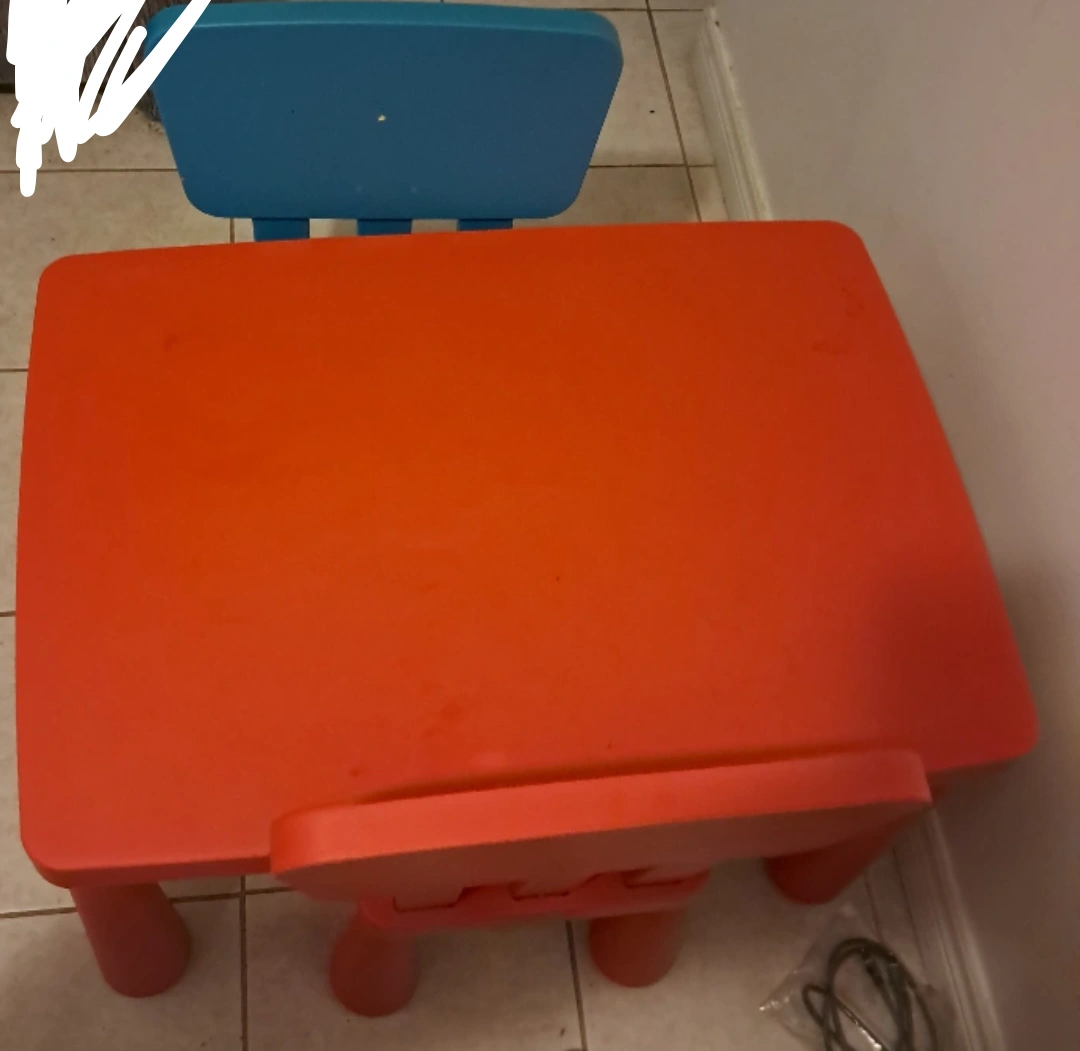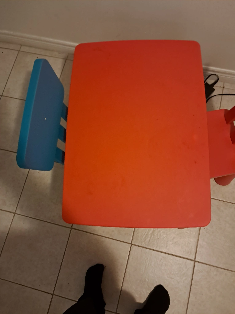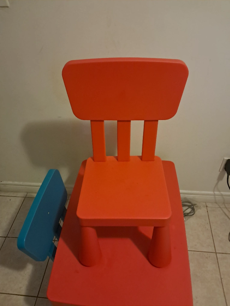 A cute little table and chair set for kids! The table is red and the chair is blue. Perfect for arts and crafts or snack time for the little ones