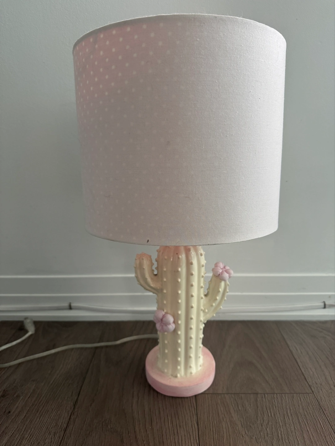 Add a touch of whimsy to any room with this adorable cactus table lamp! It features a cute cactus base with little pink flowers and a pink polka dot lampshade. Perfect for a kids' room or anyone who loves fun and colourful decor.