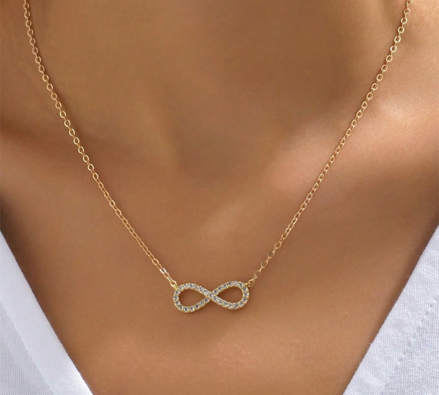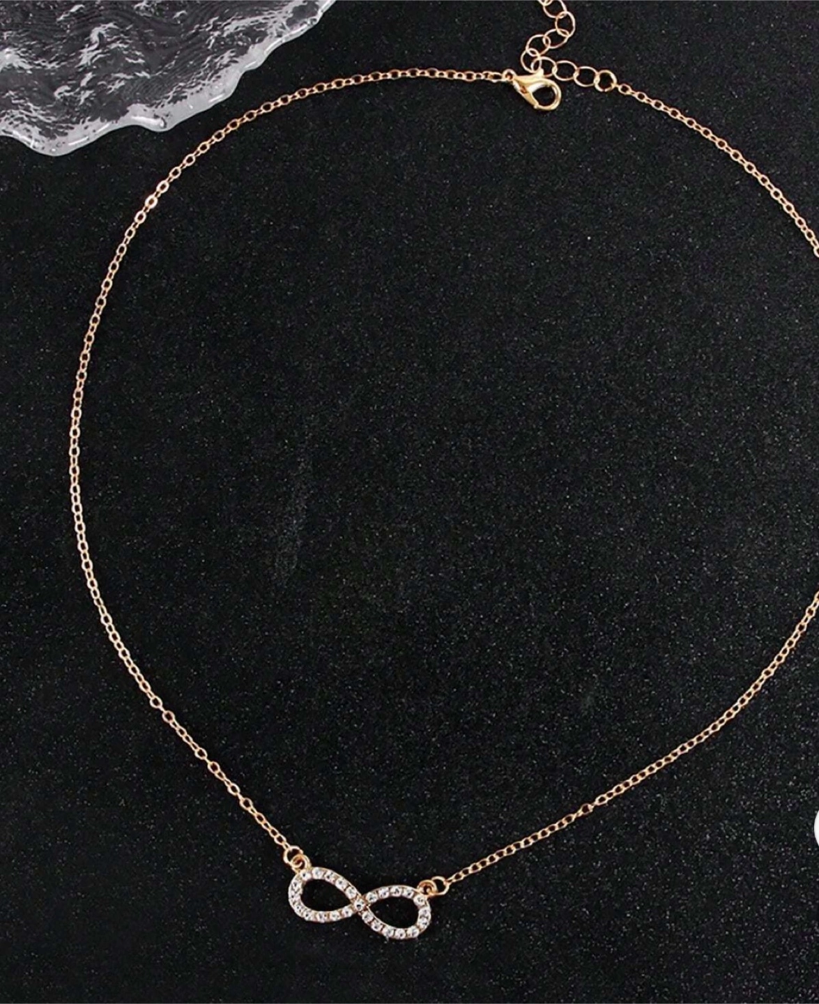 Selling a cute gold infinity necklace! It's perfect for adding a touch of sparkle to any outfit. The infinity symbol is adorned with small, shimmering stones, making it a lovely and delicate piece of jewelry