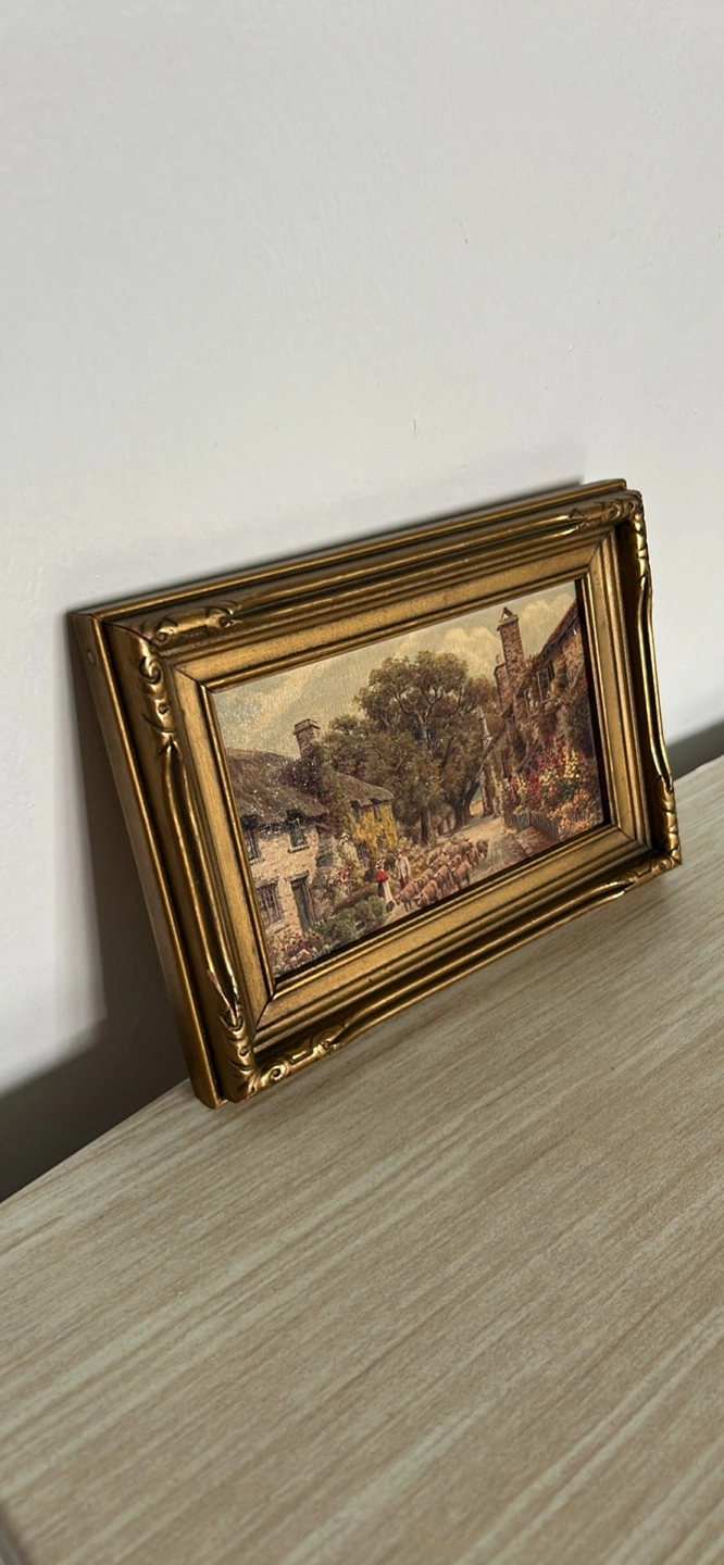 181Selling a framed vintage print. It features a charming scene of a village and some sheep. The frame is gold in colour and has some wear and tear on the back, but the print itself is in good condition