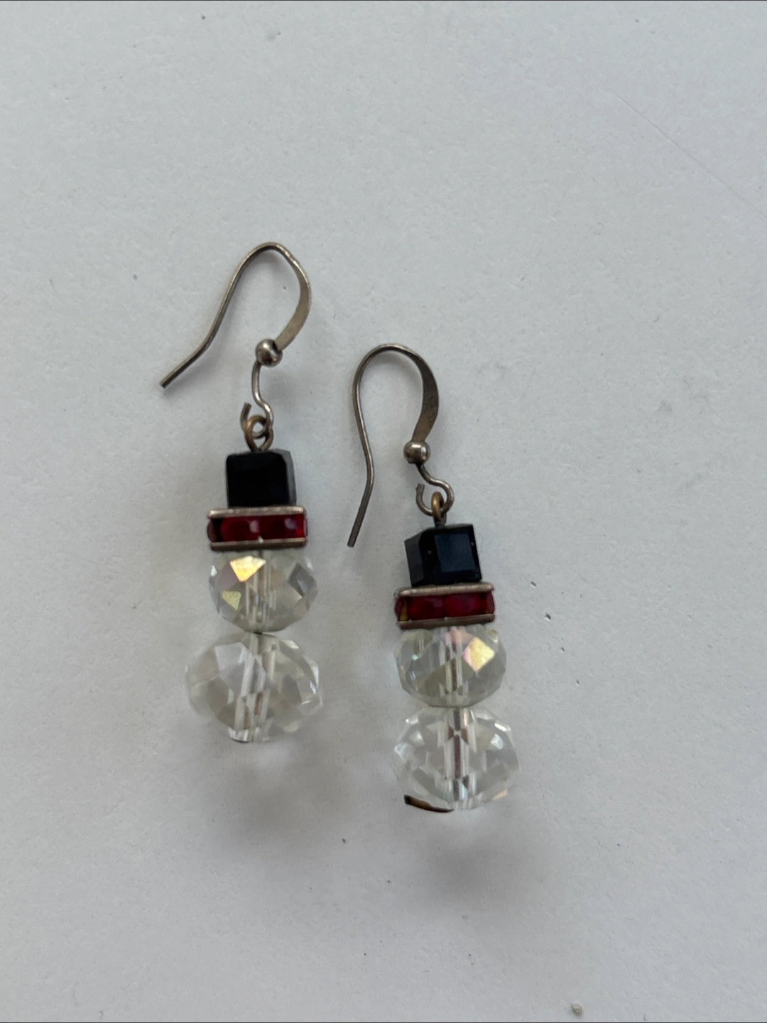 These are a cute pair of snowman dangle earrings! They feature clear and black beads with a red accent, perfect for the winter season