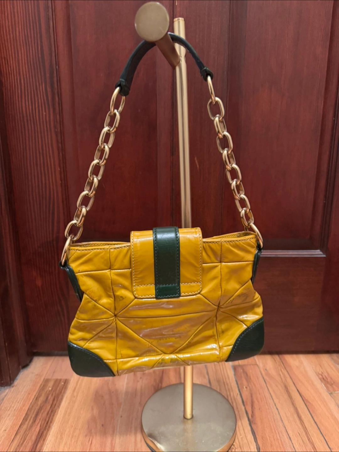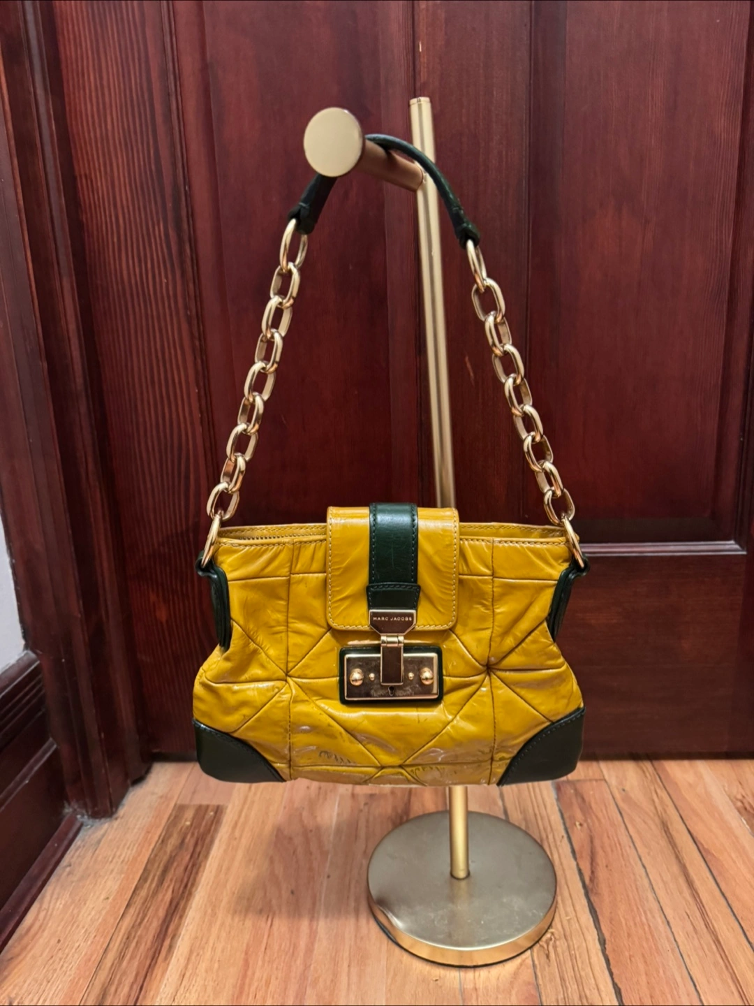 This is a Marc Jacobs shoulder bag in a unique mustard yellow color. It features a gold chain strap and dark green accents. The bag has a distinctive geometric quilted design. It's perfect for adding a pop of color to your outfit!