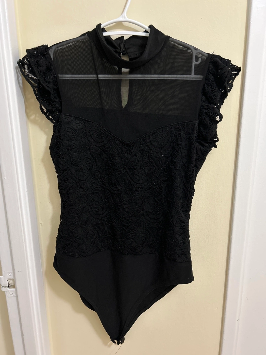 Selling a cute black bodysuit with lace detailing. It has a mesh top and short, frilly sleeves. Perfect for a night out or dressing up an outfit!
