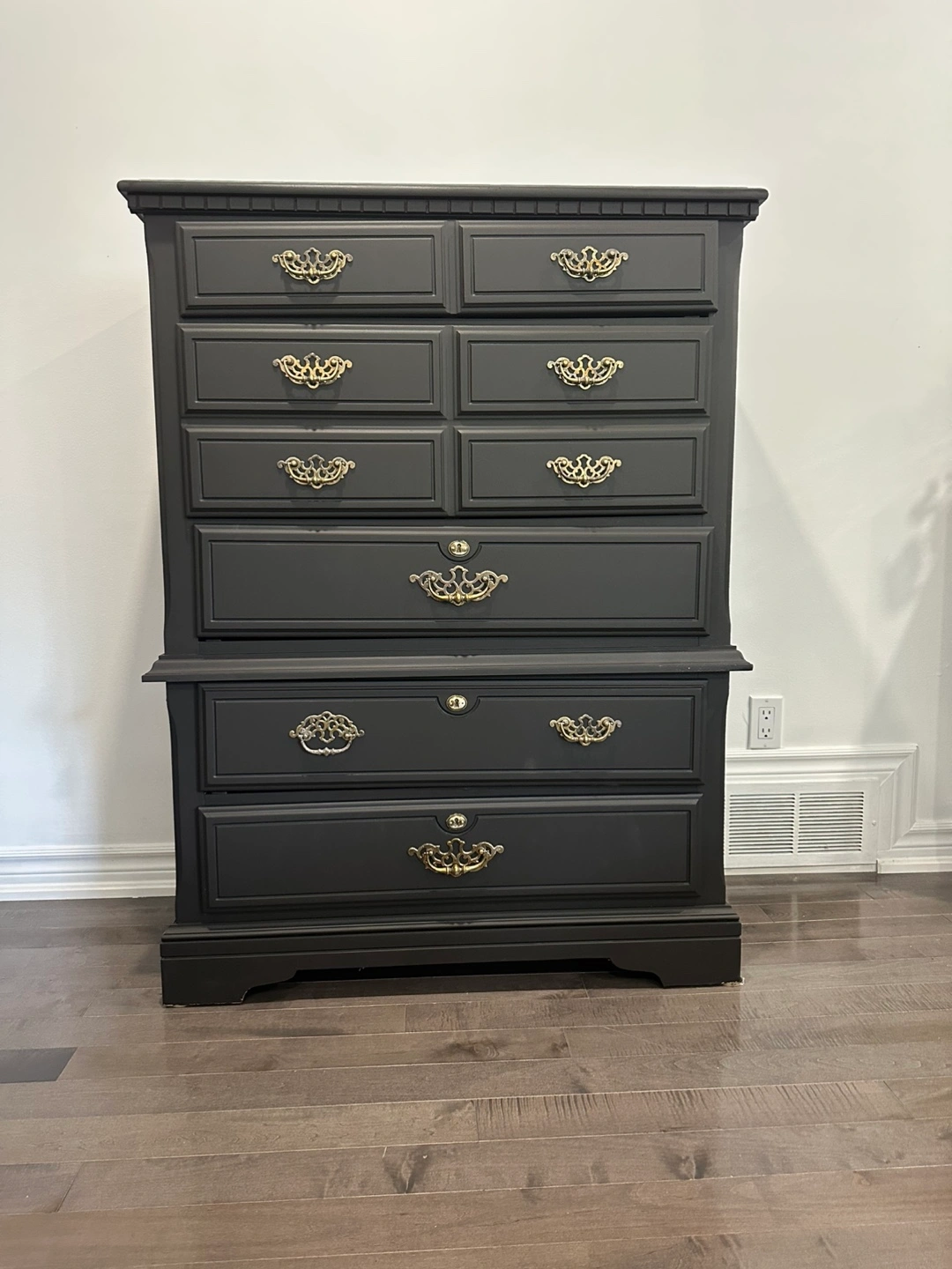 Selling a tall black dresser with elegant gold hardware. It features multiple drawers for ample storage. Perfect for adding a touch of sophistication to any bedroom!