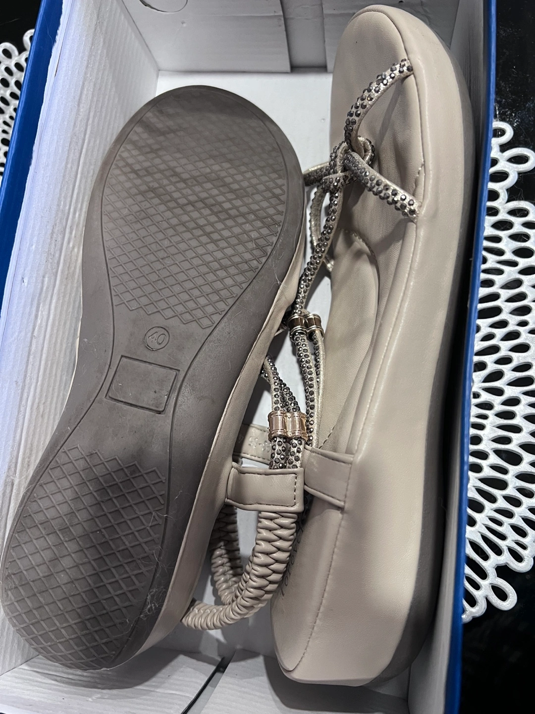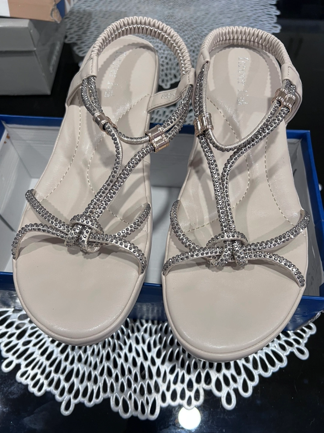 Selling a pair of Forever Link women's sandals in a lovely neutral colour! They're a size 10 and come in the original box. These sandals feature a cute, strappy design with some sparkly accents, perfect for adding a touch of glam to your summer outfits