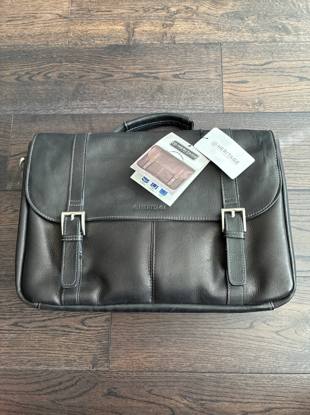 Selling a Heritage black genuine leather briefcase. Contains multiple compartments to carry items. Can hold a 16β laptop, tablet, etc. It's in good condition.